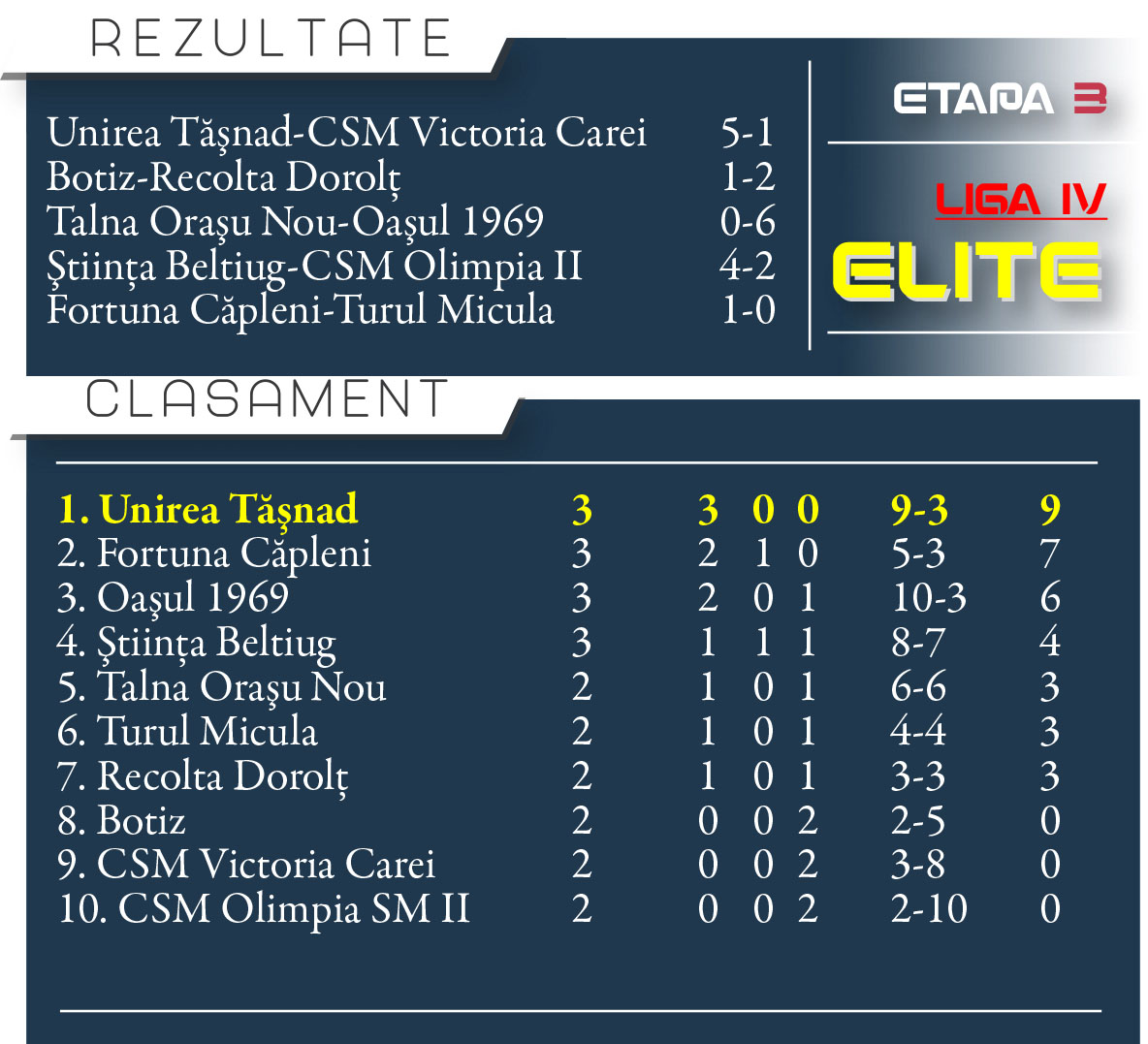 Unirea Tășnad e singura echipă cu punctaj maxim după primele trei etape. Echipa antrenată de Cosmin Iuhas a trecut clar de Victoria Carei într-un meci în care careienii au ținut piept adversarului doar în prima repriză…