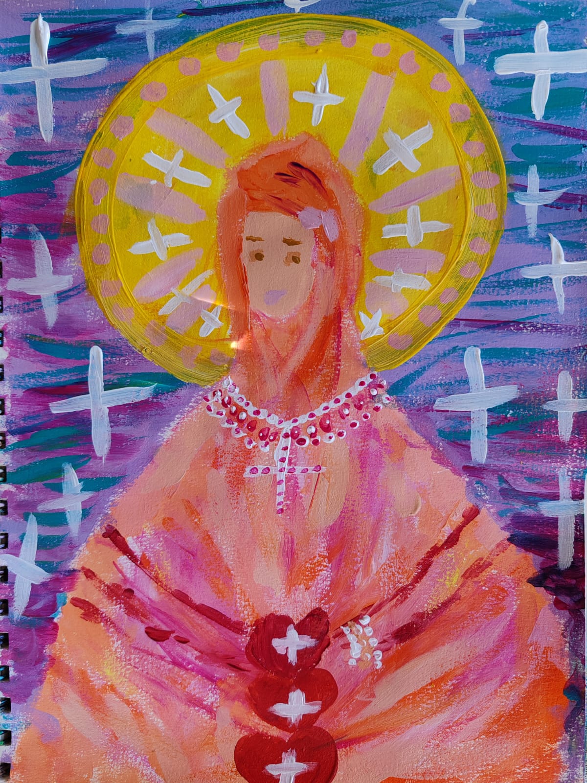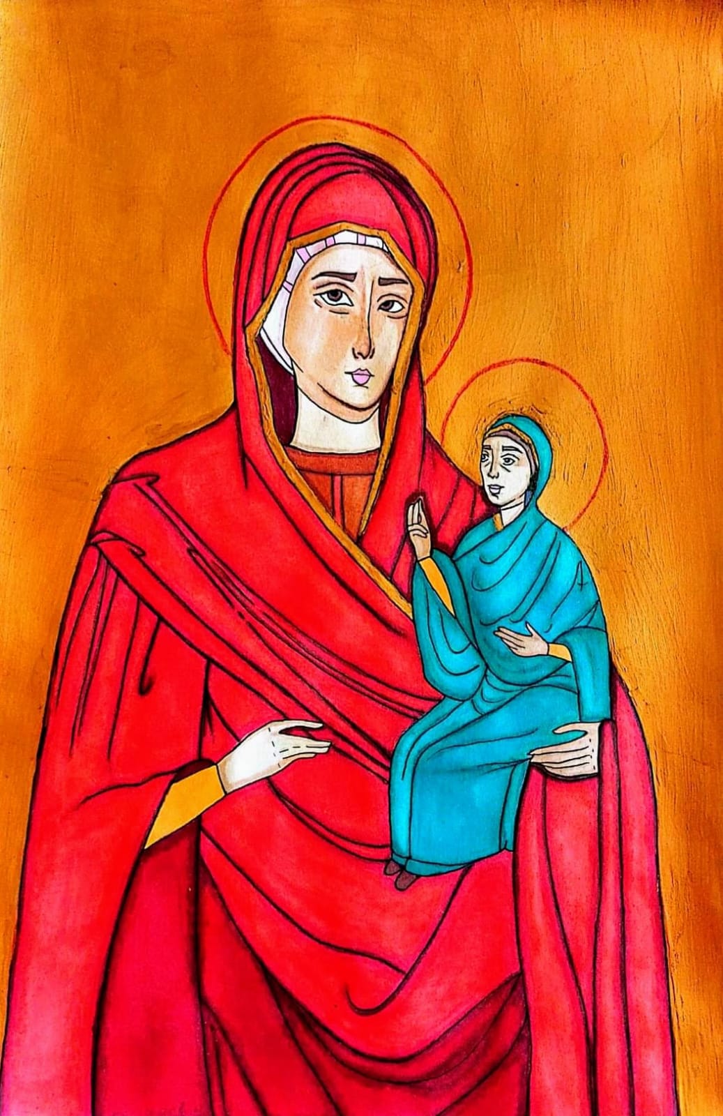 (”Fecioara Maria stăpâna inimilor noastre " - Pătraș Antonia Mara, clasa a III-a, Școala Gimnazială "Grigore Moisil" învățătoare Câmpeanu Daniela - tehnica: acrilic)
