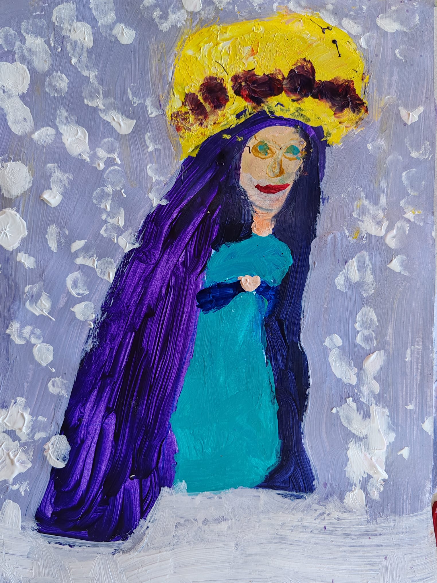 ("Fecioara Maria în zăpadă"-Chioreanu Inga, clasa a IV-a, Școala Gimnazială Grigore Moisil, învățătoare Mihalca Gabriela - tehnica: acrilic)