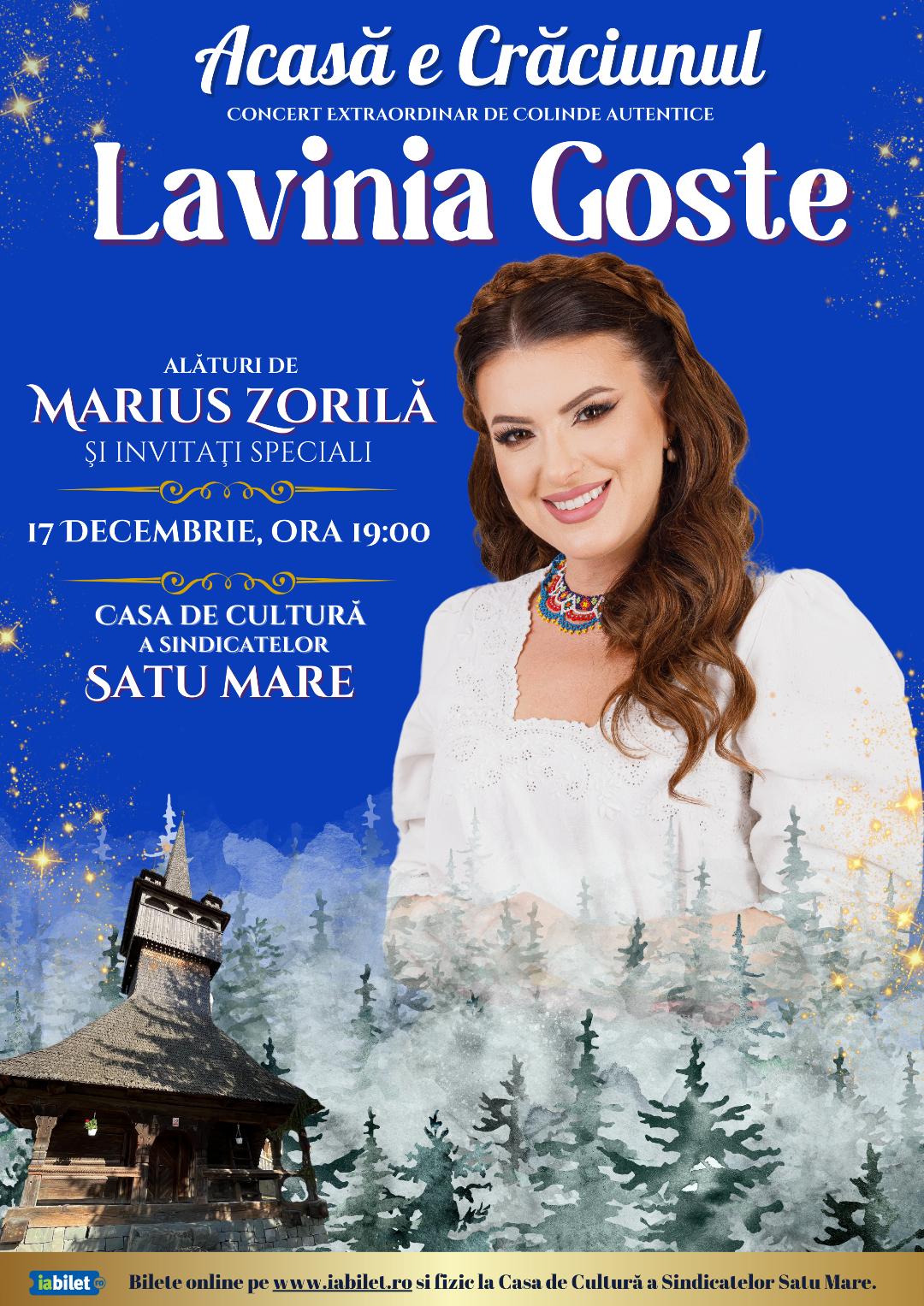 Totodată, Lavinia Goste invită publicul la un eveniment de suflet: Concertul Extraordinar de Colinde Autentice „Acasă e Crăciunul”. Concertul va avea loc în data de 17 decembrie, începând cu ora 19:00, la Casa de Cultură a Sindicatelor Satu Mare, unde artiștii vor aduce pe scenă colinde românești vechi, interpretate alături de Grupul Instrumental Valahia, sub conducerea muzicală a dirijorului Marius Zorilă, și alături de invitați speciali.