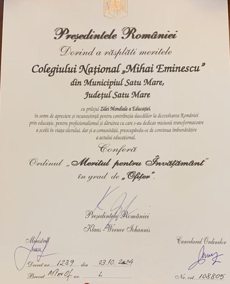 Preşedintele României, Klaus Iohannis, a decorat, de Ziua Mondială a Educaţiei, mai multe unităţi de învăţământ din țară, printre care și Colegiul Național “Mihai Eminescu” din Satu Mare. Ceremonia a avut loc marţi, 8 octombrie 2024, începând cu ora 17.00, la Palatul Cotroceni, din București. A conferit Ordinul „Meritul pentru Învăţământ în grad de Ofițer” și Colegiului Naţional „Mihai Eminescu” din Satu Mare.