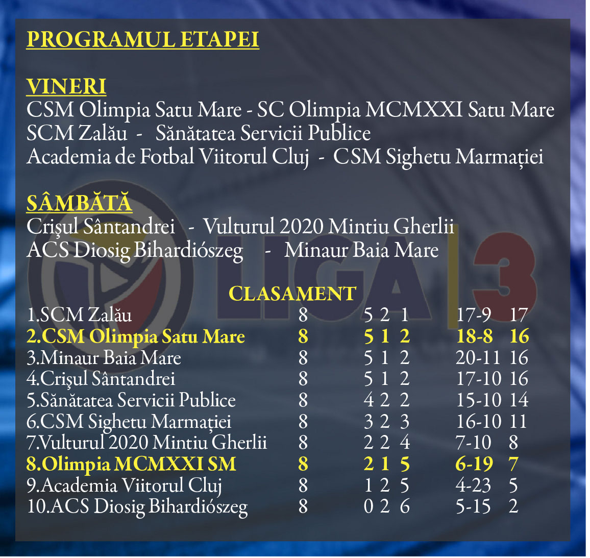 CSM Olimpia Satu Mare și SC Olimpia MCMXII Satu Mare, singurele echipe din județ rămase în Liga a 3-a se vor întâlni vineri de la ora 15 în meci direct.