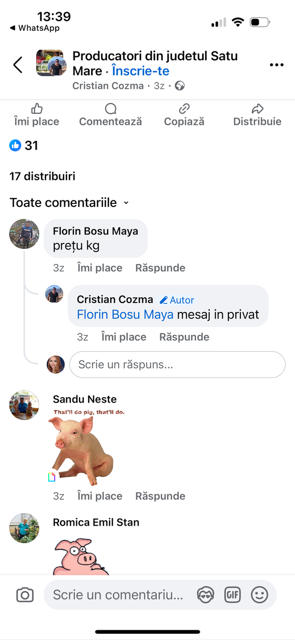 În loc să facă ceva util pentru comunitate , acesta stă pe Facebook și explică celor care sunt interesați de porcii lui Cristi cum pot intra în posesia lor și ce trebuie să facă pentru a afla prețul exact.