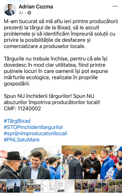 Desigur și noi suntem de acord ca fermierii să poată să își vândă animalele în târgurile din județ dar nu suntem de acord cu modul imoral, ilegal de a face politică al lui Adrian Cozma. Acesta face politică, interpelările și intervențiile exclusiv pentru apropiații lui și pe banii statului român și ai noștri, își rezolvă propriile afaceri și îi ajută pe apropiați să facă bani prin metode nu tocmai legale.