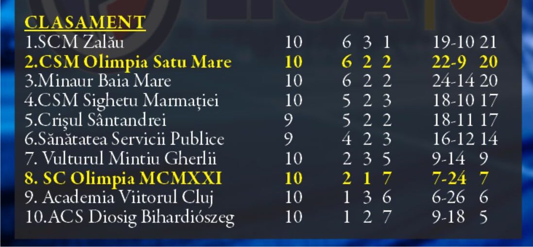 Totuși, lupta din fruntea clasamentului este foarte strânsă, liderul SCM Zalău fiind la doar un punct distanță, iar Minaur Baia Mare, aflată pe poziția a 3-a, are același număr de puncte (20). Crișul, adversara de vineri, ocupă locul cinci, iar CSM Sighetu Marmației, echipa de pe locul patru, sunt ambele la trei puncte în urma echipei din Satu Mare. Cu mențiunea că echipa bihoreană mai are de jucat restanța cu Sănătatea Cluj Napoca.