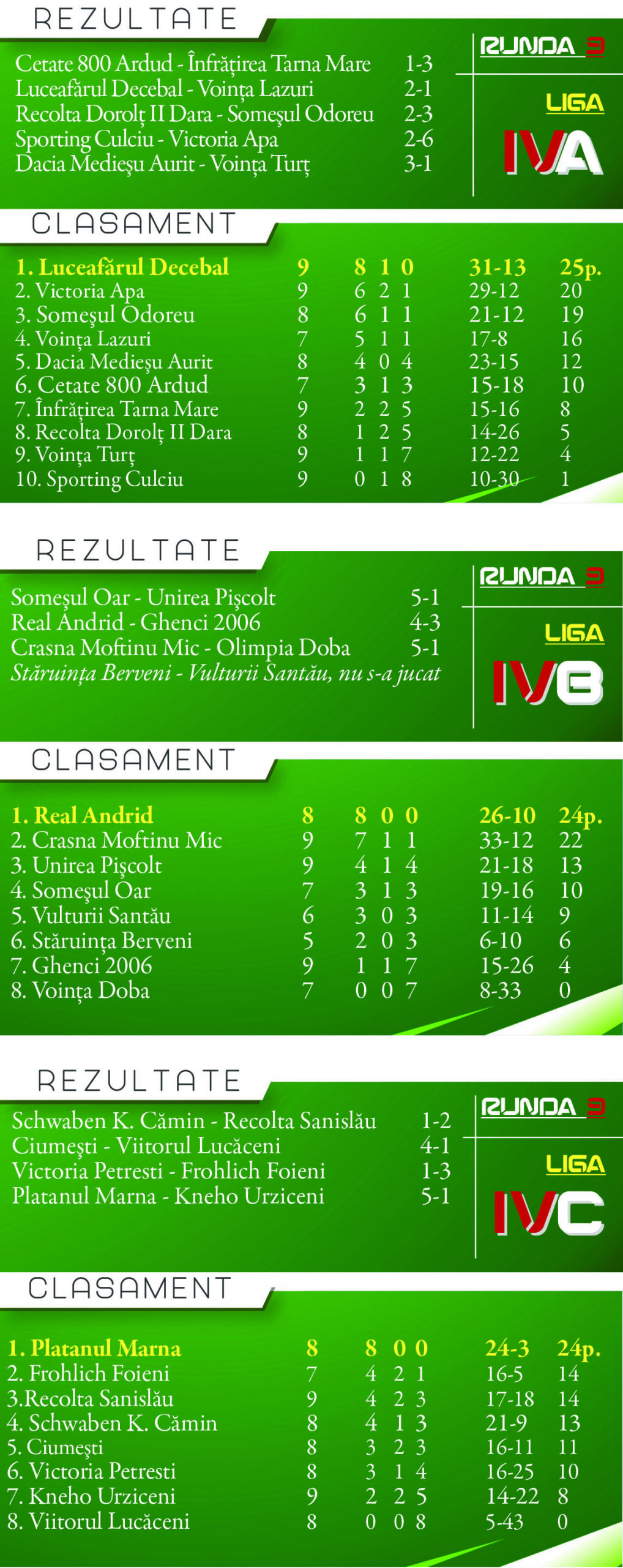 Cu mențiunea că echipa din Decebal are opt victorii și o remiză în cele nouă etape jucate în vreme ce liderii din seriile B și C, Real Andrid și Platanul Marna au terminat anul cu un parcurs perfect, opt victorii din tot atâtea meciuri jucate.