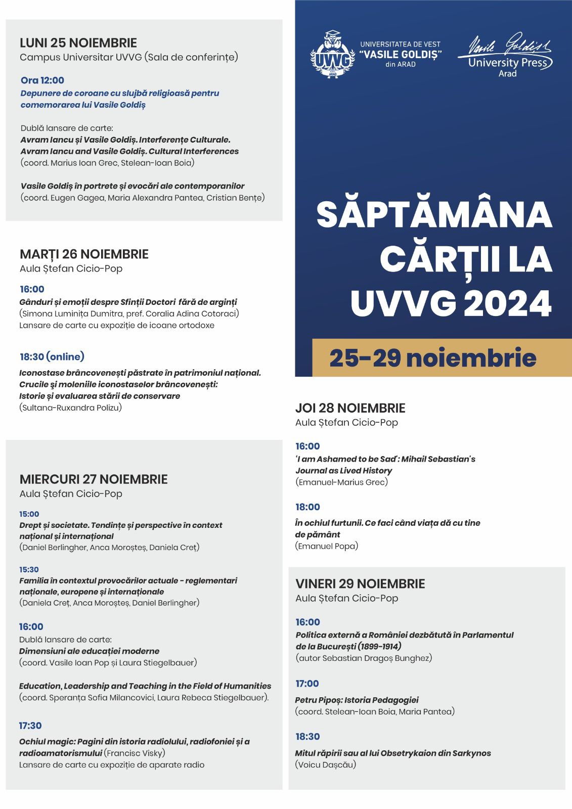 În perioada 25-29 noiembrie 2024, Universitatea de Vest „Vasile Goldiș” din Arad organizează Săptămâna Cărții, o sărbătoare culturală ce pune în prim-plan valorile patrimoniului editorial și academic. Evenimentul, organizat împreună cu Editura Universității, va avea loc în două locații emblematice ale instituției: Aula Ștefan Cicio-Pop din cadrul clădirii Rectoratului UVVG (Bdul Revoluției, nr. 94-96) și în Campusul Universitar (str. Liviu Rebreanu, nr. 86).