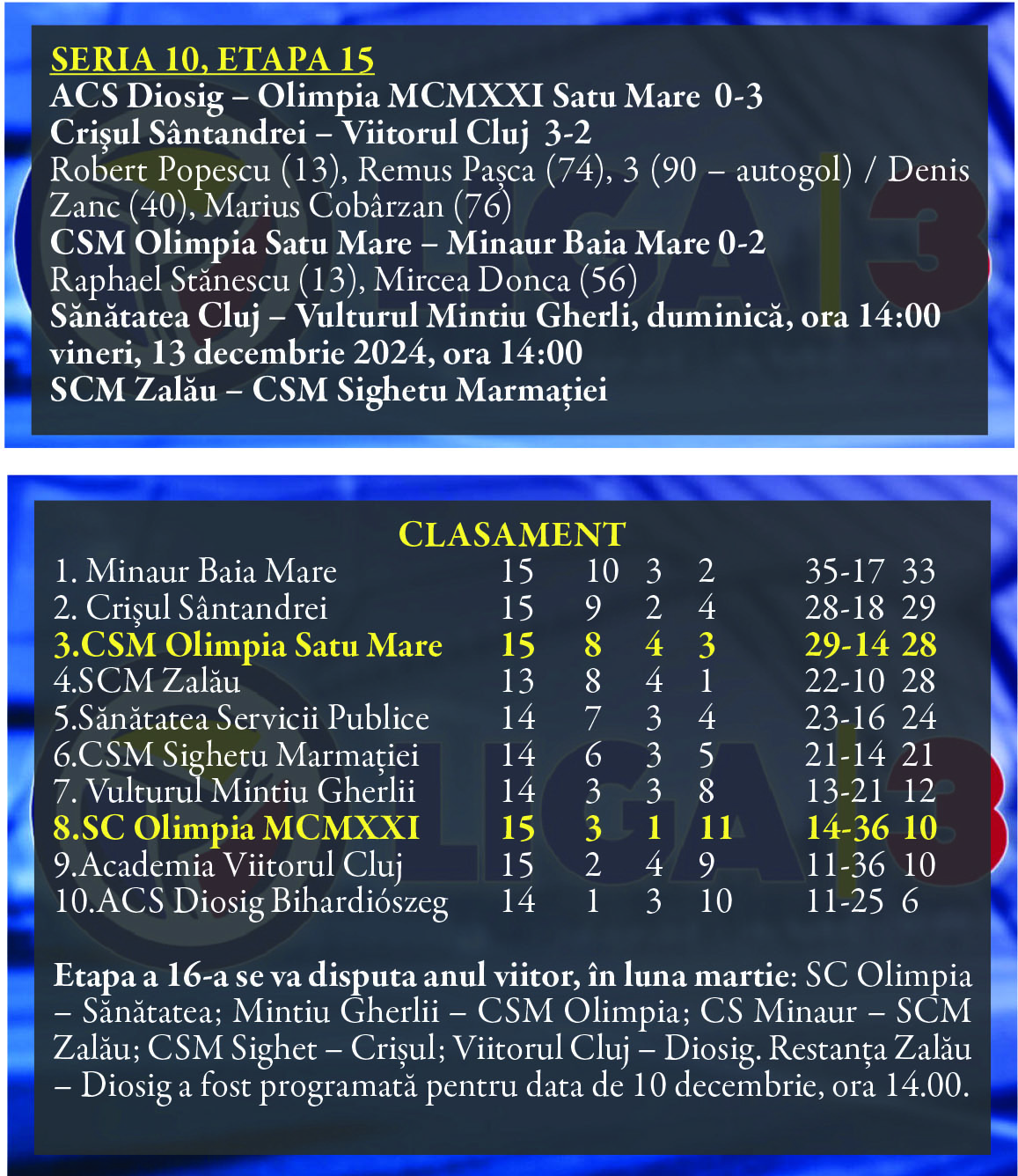 Scorul final a rămas 0–2, iar CSM Olimpia încheie anul cu 8 victorii, 4 egaluri și 3 înfrângeri. Echipa ocupă în prezent locul 3 în clasamentul seriei, însă SCM Zalău, aflată tot cu 28 de puncte, mai are de recuperat două meciuri până la reluarea campionatului pe 1 martie.