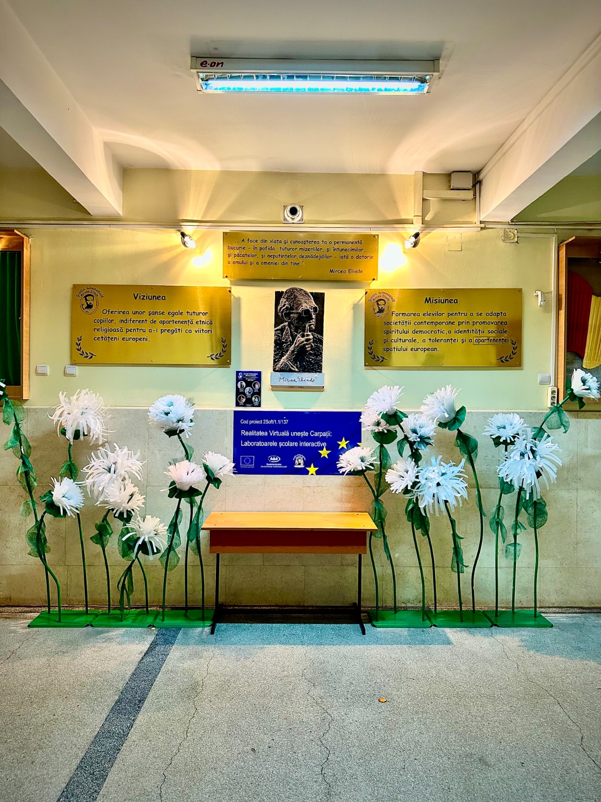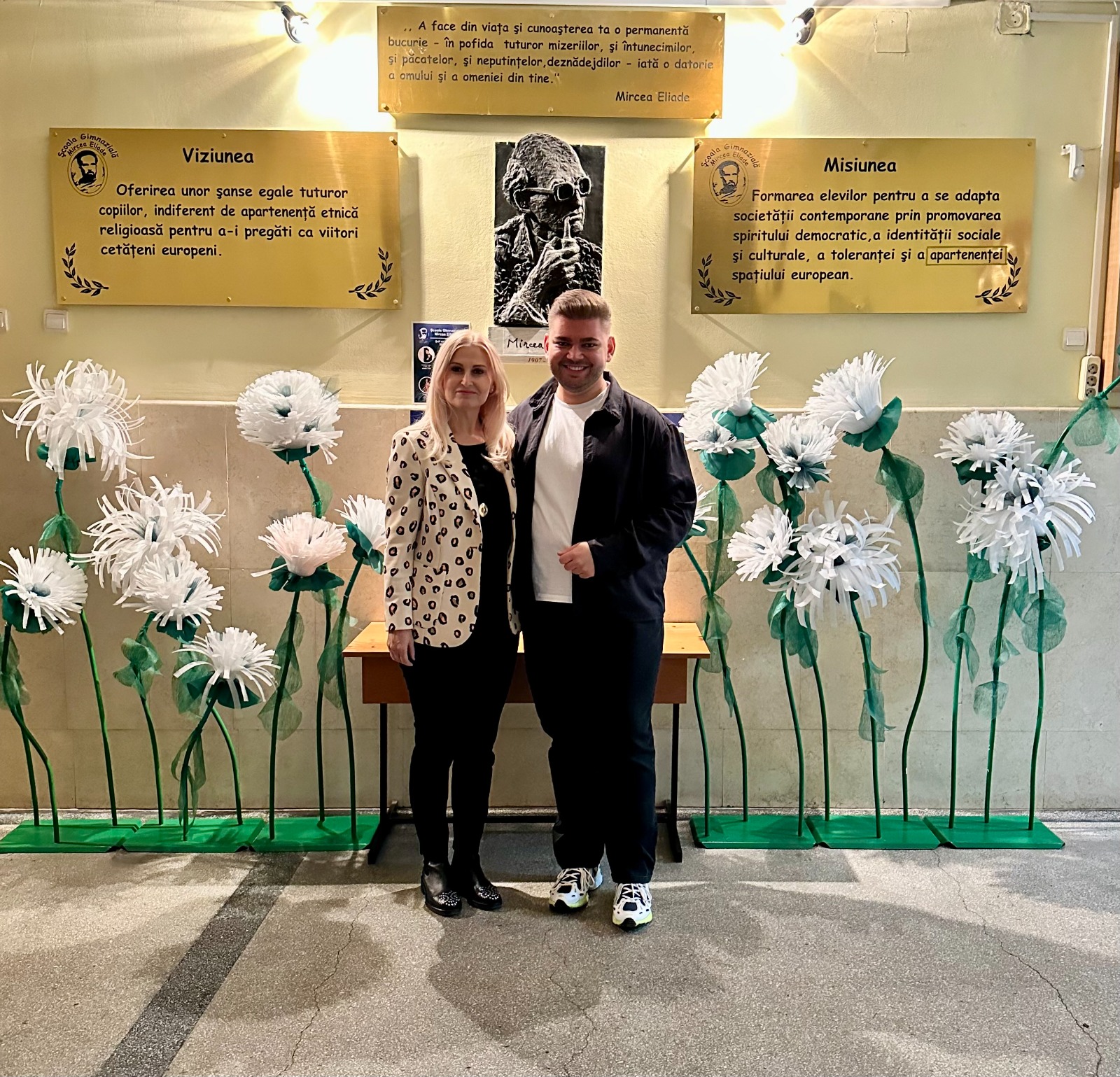 o școală de prestigiu, o școală care a oferit societății oameni valoroși ... o școală care poartă cu mândrie numele marelui scriitor Mircea Eliade începând cu anul 1989. Această școală reprezintă locul în care am înțeles adevăratele definiții ale termenilor iubire, succes, familie, onoare și dor ... totodată ... și locul de suflet în care revin, cu drag și mândrie, de fiecare dată când am ocazia. Aici am cunoscut oameni atât de buni și frumoși, atât de profesioniști, umani și empatici, încât îmi e greu să găsesc cuvinte suficient de mari pentru a descrie tot ceea ce simt. Aici am primit harul de a scrie cu stiloul, dar și cu sufletul, și darul de a ajunge în inimile dragilor mei cititori. Aici m-am format și am crescut din toate punctele de vedere, începând cu cuvintele “mama” și “tata”, scrise sfios pentru prima dată în Abecedar ... și continuând cu pasiunea pentru literatură, pentru artă, cu mândria de a cunoaște limbile moderne și cu ambiția de a deveni un cetățean plin de spirit civic. Aici, Vlăduț a văzut pentru prima oară lumina unei lumi minunate și a celui mai frumos dar primit vreodată: viața.
