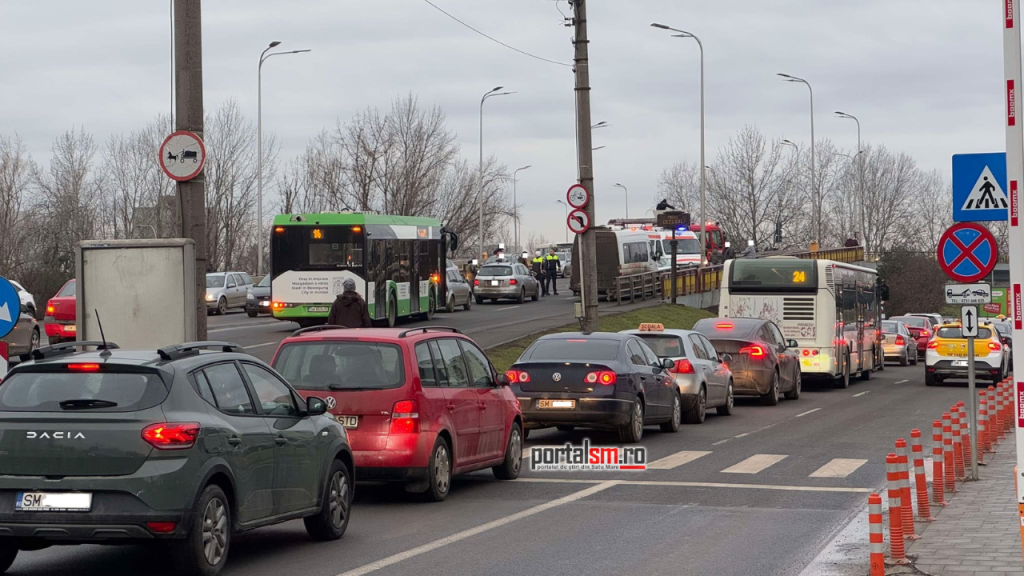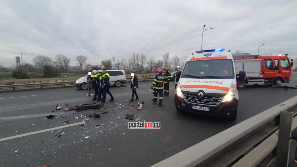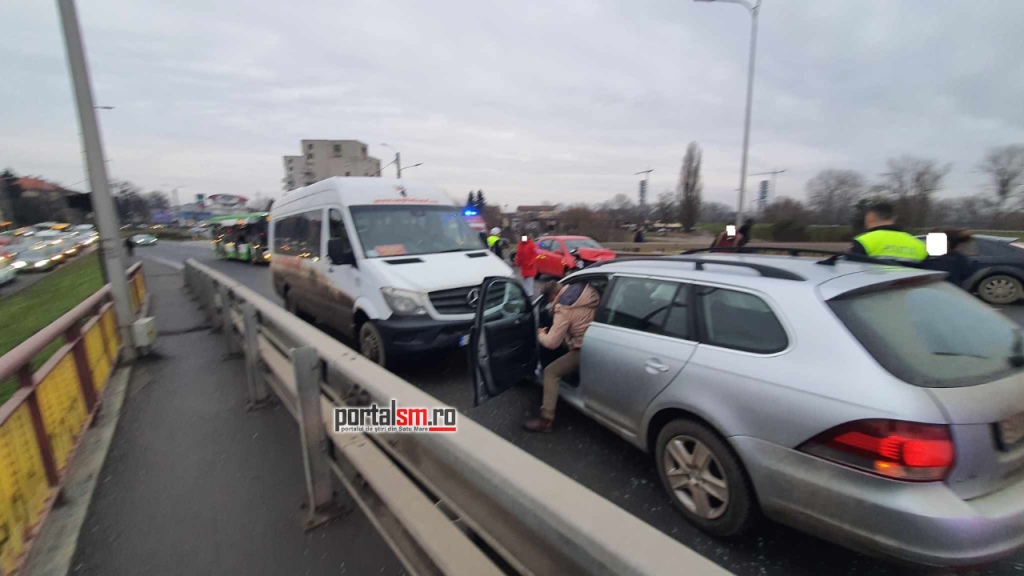 Un accident rutier în lanț a avut loc astăzi, în jurul orei 16:00, pe Podul Decebal din municipiul Satu Mare. Potrivit primelor informații, în incident au fost implicate două autoturisme și un microbuz care transporta pasageri.
