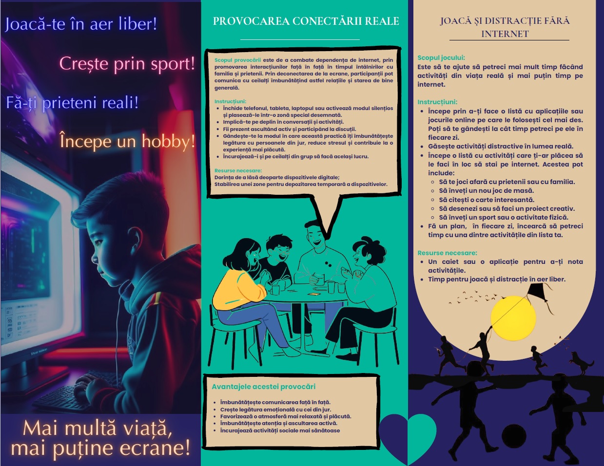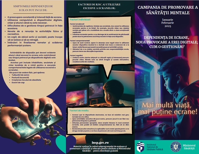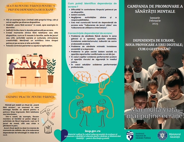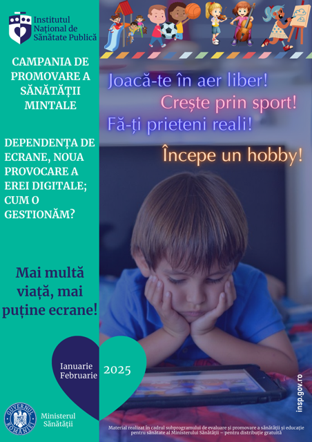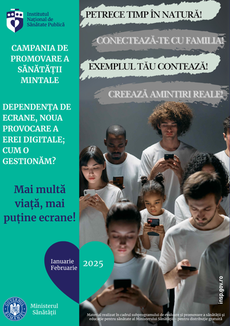 Sub sloganul „Mai multă viață, mai puține ecrane!” în perioada lunilor ianuarie și februarie 2025, ne îndreptăm atenția spre promovarea sănătății mintale, organizând la nivel național campania cu tema „Dependența de ecrane, noua provocare a erei digitale – cum o gestionăm?”