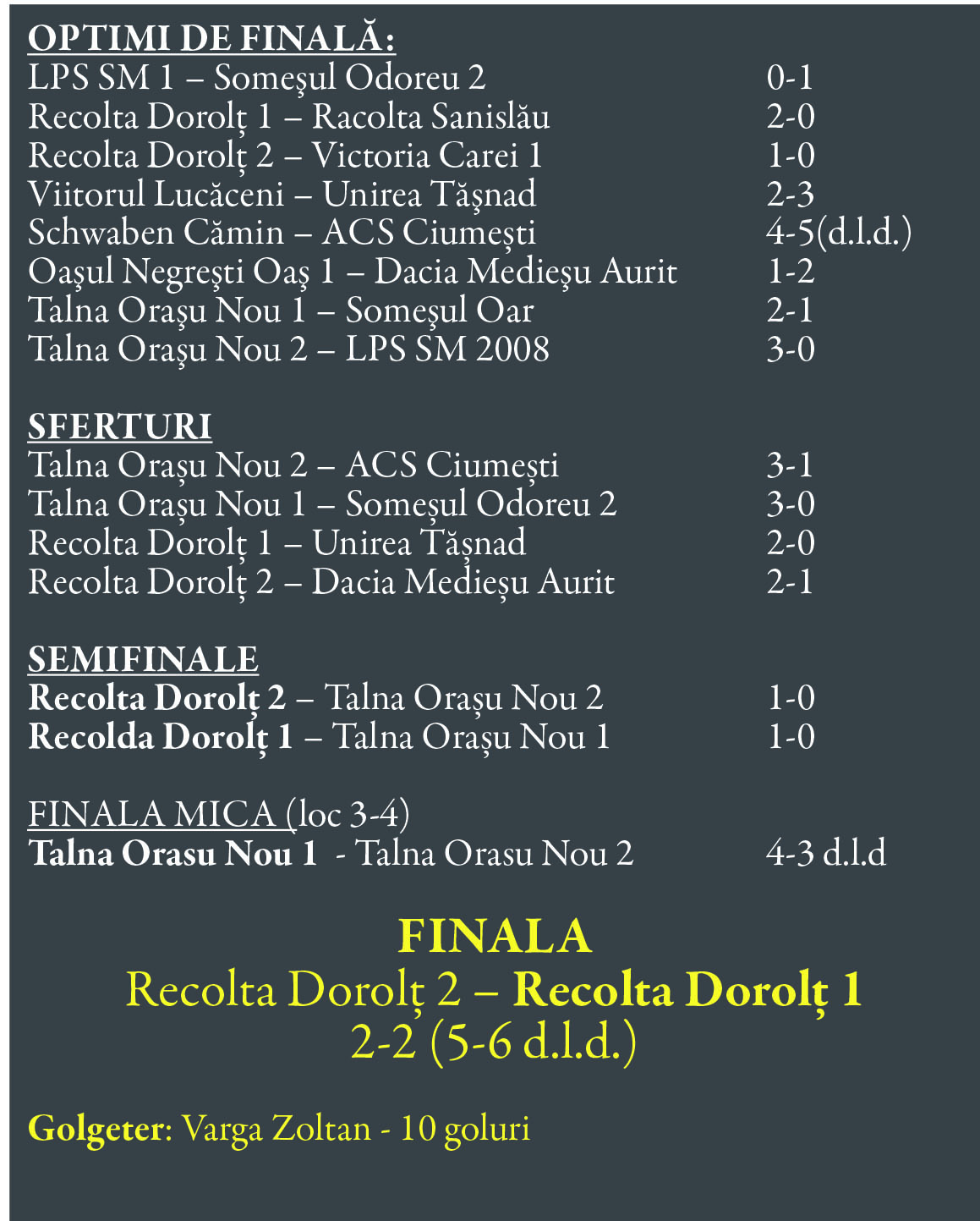 A câștigat cu oarece noroc, Recolta I Dorolț, 4-3, după executarea loviturilor de departajare. S-a terminat 2-2 în timpul regulamentar cu un gol egalizator reușit de prima echipă cu 30 de secunde înaintea finalului...