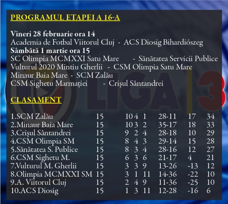 Etapa a 16-a a Ligii a 3-a începe vineri cu duelul ultimelor două clasate și continuă sâmbătă cu derby-ul primelor două clasate și cu meciurile echipelor sătmărene, CSM Olimpia la Mintiu Gherlii și SC Olimpia MCMXII , acasă cu Sănătatea Cluj Napoca.