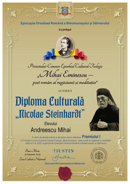 Cu binecuvântarea Preasfințitului Părinte Iustin, Episcopul Maramureșului și Sătmarului, în perioada 15-25 ianuarie 2025, Sectorul Cultural și Comunicații Media a organizat cea de-a IV-a ediție consecutivă a Proiectului-Eparhial Cultural-Teologic intitulat „Mihai Eminescu – poet român al rugăciunii și meditației”, prilejuit de Ziua Culturii Naționale, cu ocazia împlinirii a 175 de ani de la nașterea marelui poet național.