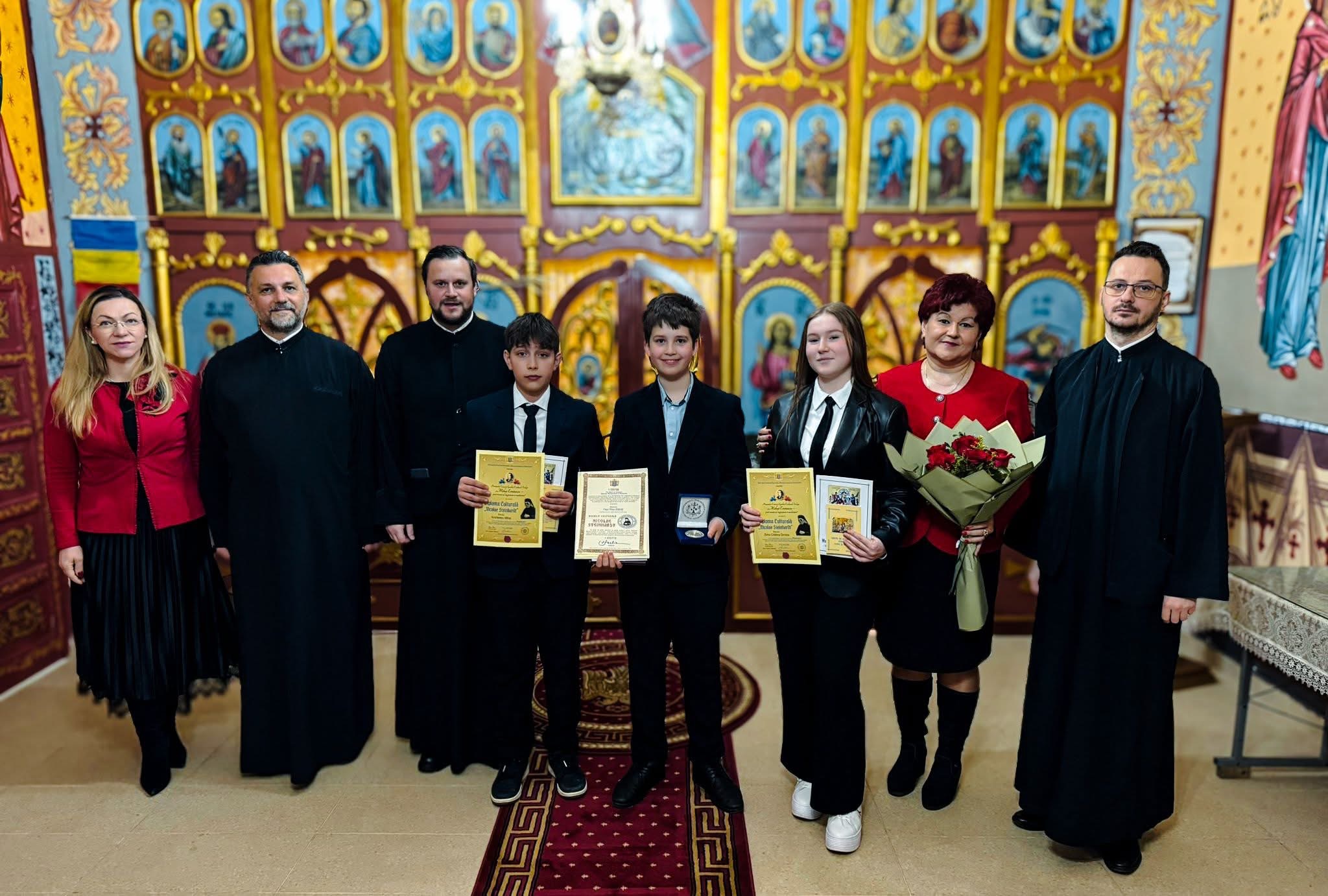 Părintele Adrian Dobreanu a transmis mesajul de felicitare și apreciere din partea Întâistătătorului Eparhiei noastre, după care, doamna director și părintele protopop au felicitat pe elevi pentru premiile obținute.