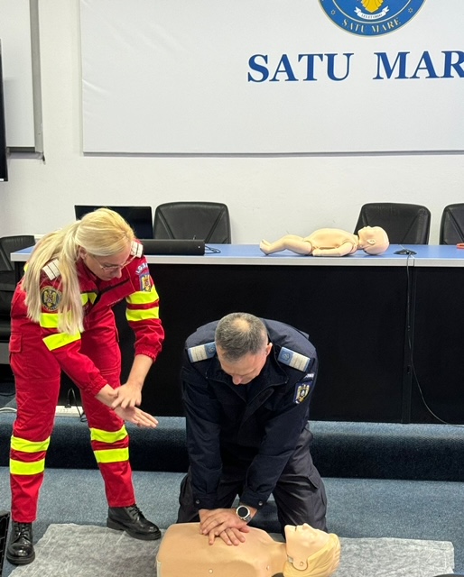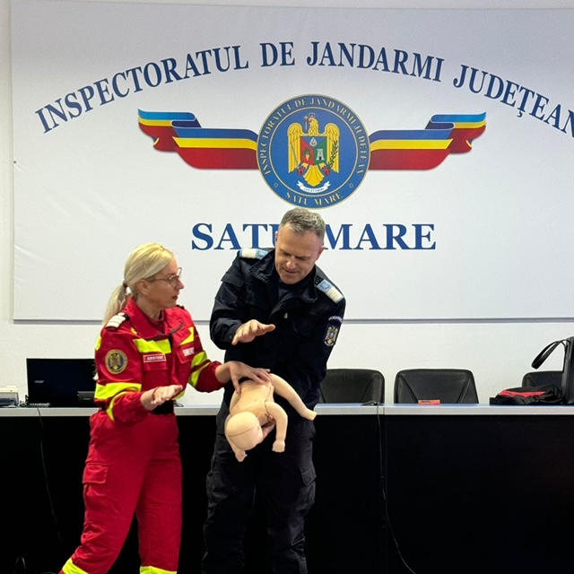 Doamna plt. adj. Ramona Ardelean coordonator SMURD Satu Mare i-a instruit pe jandarmii sătmăreni și le-a oferit informații de bază despre modul de acțiune în situații care să necesite prim ajutor imediat.