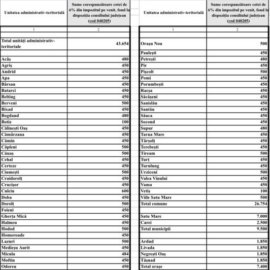 Este vorba despre repartizarea cotei de 6% din impozitul pe venit, alocată județului pentru anul 2025. Cele 43.654.000 lei a fost distribuită unităților administrativ-teritoriale pentru susținerea programelor de dezvoltare locală.