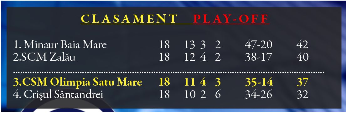 În urma rezultatelor de sâmbătă din ultima etapă a sezonului regulat s-a stabilit și ierarhia finală a play off-ului Ligii a 3-a . În seria a 10-a au rămas în cursa pentru promovare, Minaur Baia Mare , SCM Zalău, CSM Olimpia Satu Mare și Crișul Sântandrei.