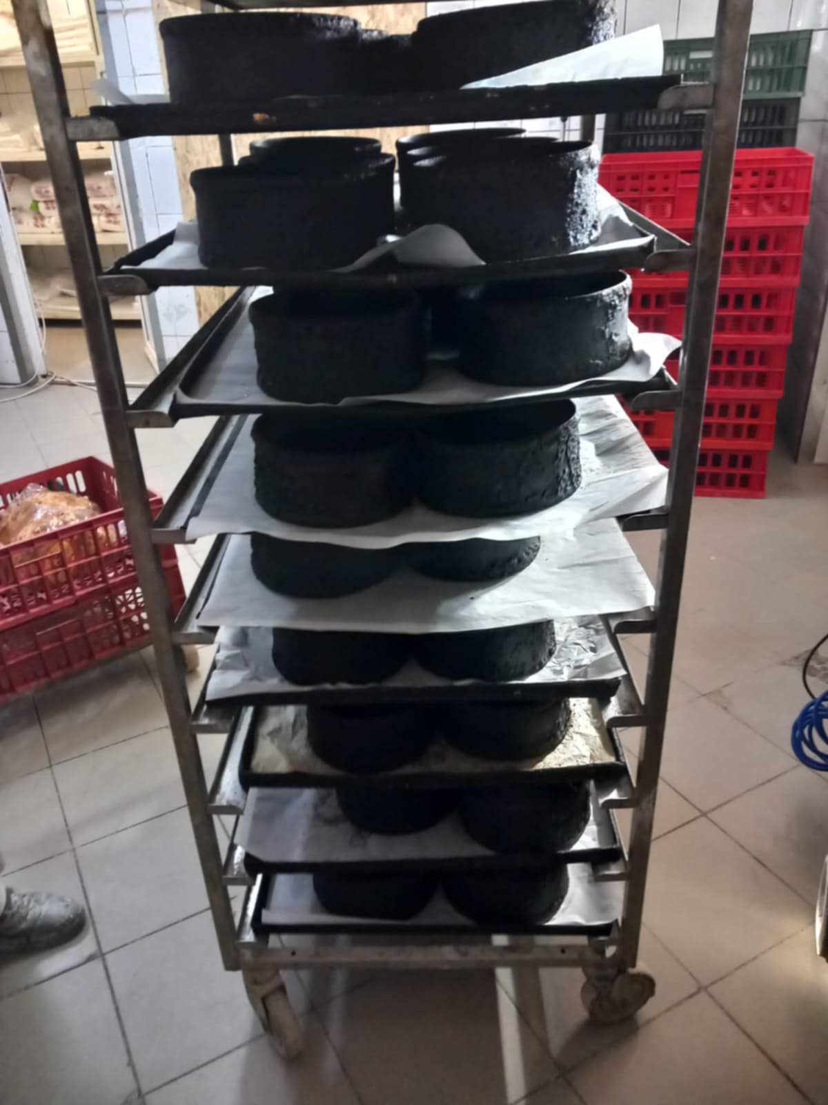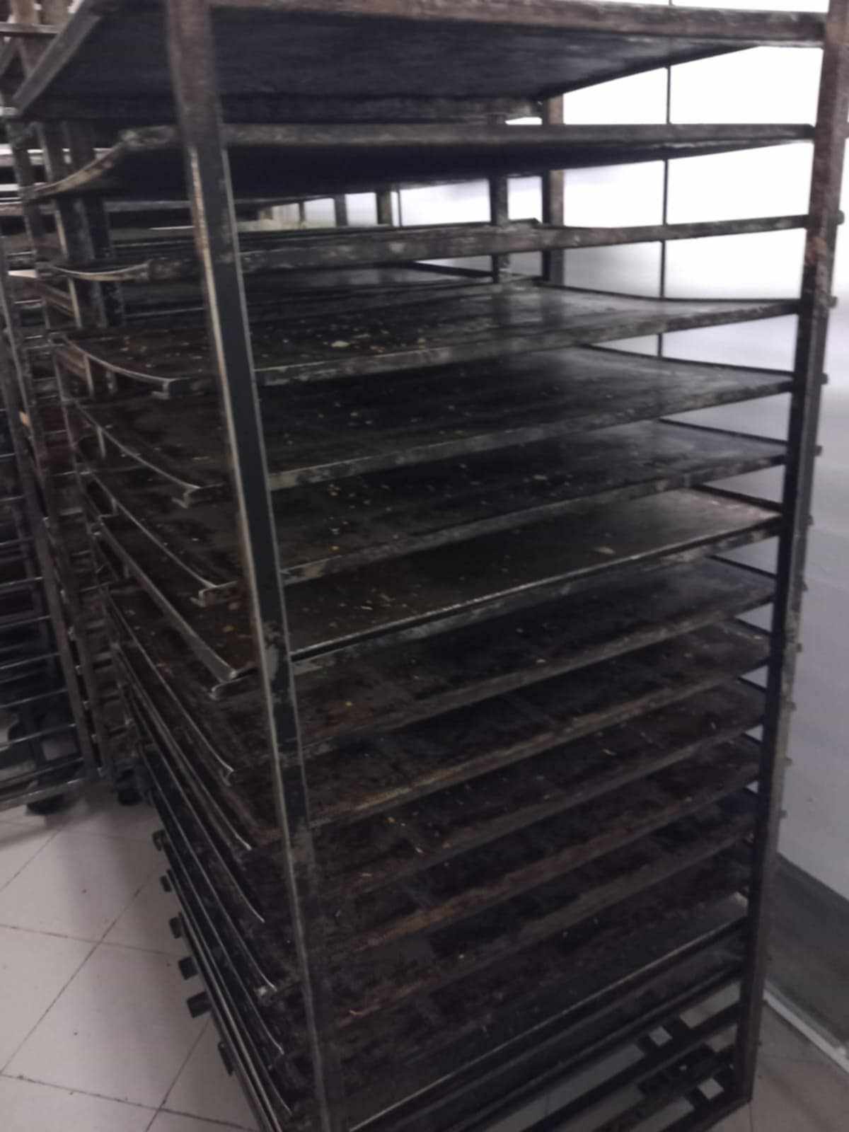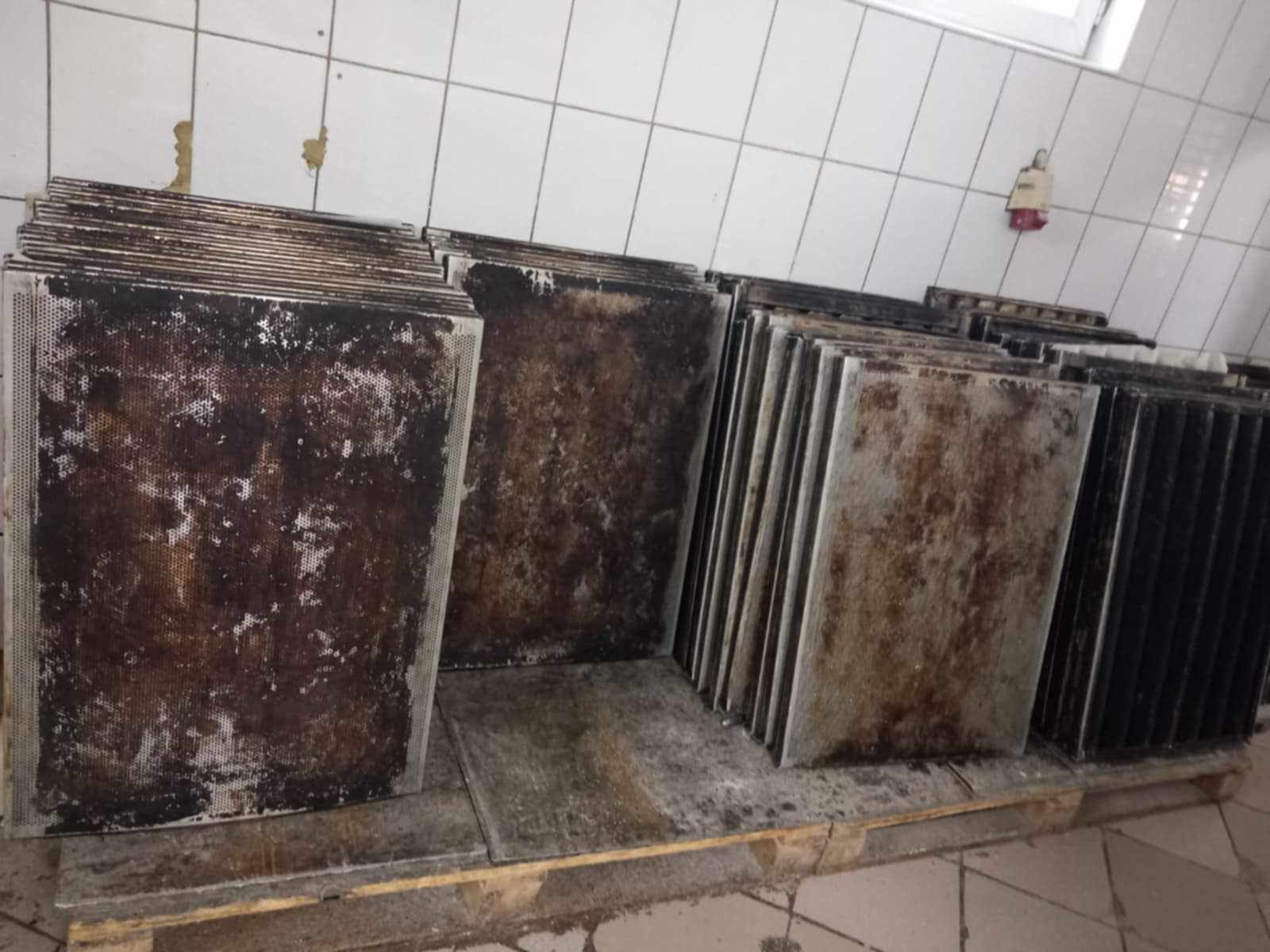 Tăvi uzate și ruginite: Tăvile folosite pentru prepararea produselor erau foarte uzate, ruginite și înnegrite de arsură, ceea ce ar putea afecta atât aspectul, cât și calitatea produselor coapte.