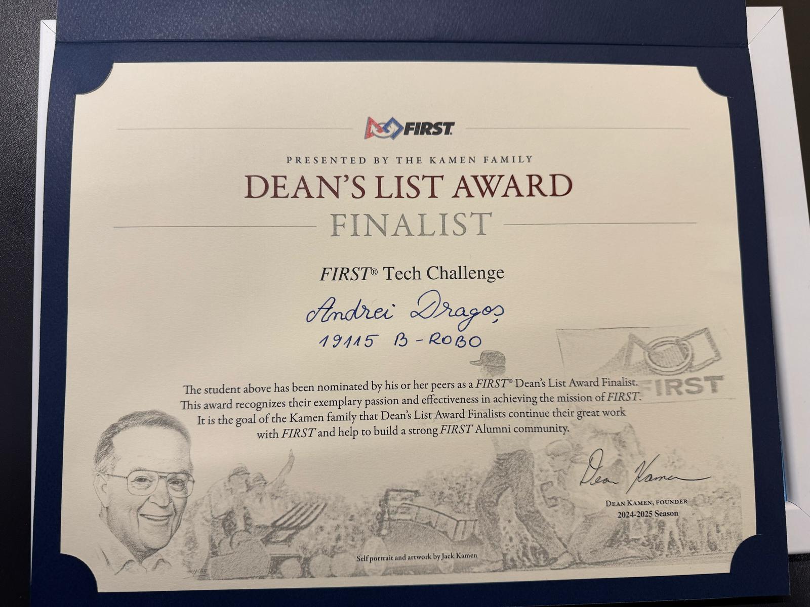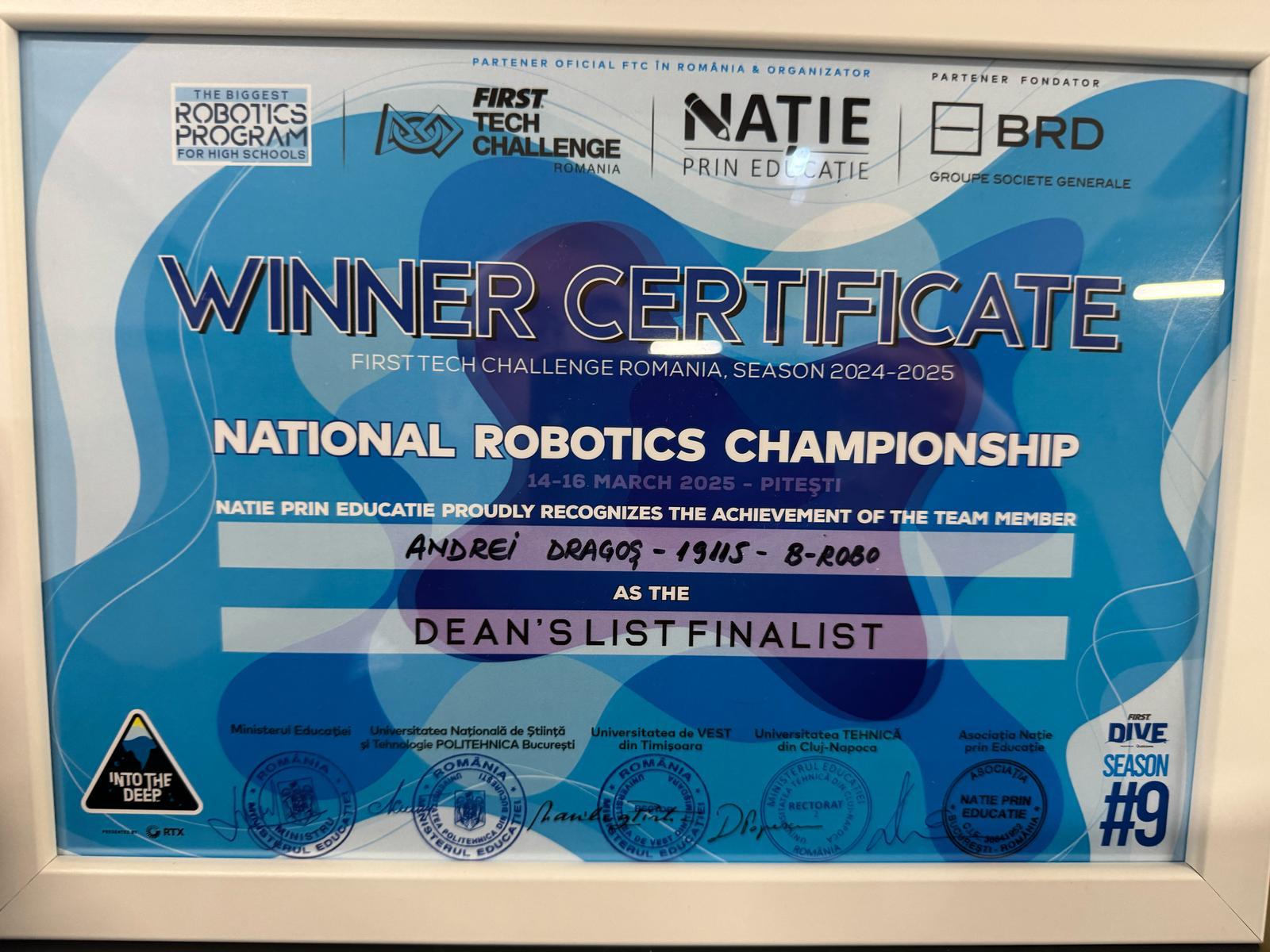Unul dintre cele mai remarcabile momente ale competiției a fost calificarea la Campionatul Mondial de la Houston, Texas, Statele Unite ale Americii, realizare posibilă datorită nominalizării din partea echipei B-Robo de către mentorii coordonatori, a membrului nostru, Andrei Dragoș, care a obținut titlul de FINALIST în cadrul secțiunii Dean’s List.