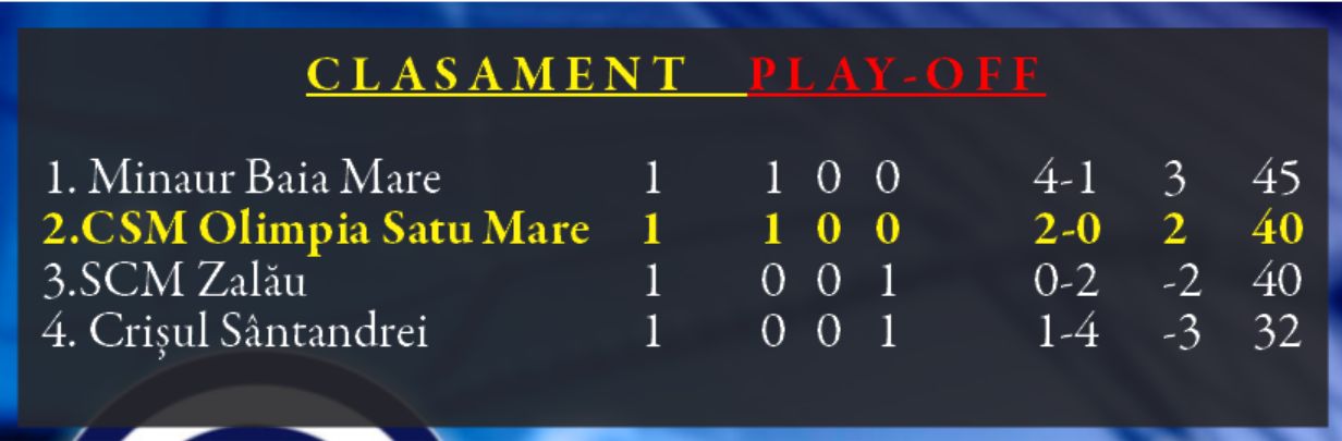 Început perfect de play off pentru CSM Olimpia Satu Mare. Echipa antrenată de trio-ul Bogdan Lobonț-Alexandru Botoș-Schvarzkopf Istvan a dat lovitura sâmbătă la Zalău chiar pe terenul principalei contracandidate la locul 2 din serie, ce duce la barajul de promovare.