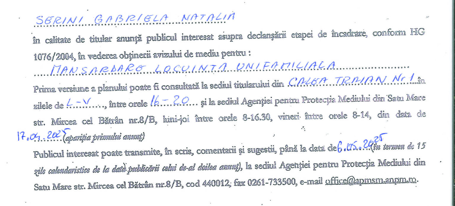 Anunț de mediu mansardare locuință unifamiliala 2 Publicitate • 21.04.2025 00:00 | Distribuie: Primește ziarul gratuit pe email! Abonează-te și citești ziarul Gazeta Nord-Vest zilnic, gratuit. Abonează-te Acasa Publicitate Anunț de mediu mansardare locuință unifamiliala 2 Articole Similare Publicitate ANUNȚ MEDIU ROMANTIC AIM SRL acum 2 zile Publicitate Anunț SC Bio Piersicuta SRL – pentru Ocolul Silvic Codrii Satmarului acum 4 zile Publicitate Anunt mediu Distribuție Energie Electrică Romania – Sucursala Satu Mare acum 5 zile Publicitate ANUNȚ POMIAN VASILE acum 5 zile Publicitate Anunț Mediu BOVAGRO Pișcari acum 1 saptamana Publicitate Condoleanțe Szabó Francisc acum 2 saptamani Ultimele Articole Locale Complexul de Educație Ecologică „Casa verde” din Grădina Romei, a fost gazda festivității de lansare a unui nou proiect de mediu cu titlul: GRĂDINIȚE SALVATOARE DE RÂURI acum 11 ore Locale Viceprimarul Cristina Tămășan Ilieș felicită Poliția Locală. Acțiuni intensificate împotriva cerșetoriei în Satu Mare acum 12 ore Locale Peste 10.000 de cărți electronice de identitate emise în Satu Mare. Viceprimarul Raul Băbțan: „Digitalizarea devine realitate” acum 12 ore Locale Deputatul Mircea Govor: Bugetul României a fost adoptat. Investiții importante pentru județul Satu Mare acum 12 ore Locale Cea mai mare creșă din Satu Mare, aproape de finalizare: 110 locuri pentru copii acum 12 ore Locale Deratizare în Satu Mare, în perioada 23–27 martie 2026. Avertisment pentru populație acum 12 ore Cele mai citite 1 Complexul de Educație Ecologică „Casa verde” din Grădina Romei, a fost gazda festivității de lansare a unui nou proiect de mediu cu titlul: GRĂDINIȚE SALVATOARE DE RÂURI 2 NORD VEST TV. Slăbitul cu injecții, între speranță și risc. Avertismentul unui medic gastroenterolog din Satu Mare 3 Cea mai mare creșă din Satu Mare, aproape de finalizare: 110 locuri pentru copii 4 Viceprimarul Cristina Tămășan Ilieș felicită Poliția Locală. Acțiuni intensificate împotriva cerșetoriei în Satu Mare 5 APASERV. Grupa Albinuțelor de la Grădinița 14 Mai a descoperit drumul apei Din aceeasi categorie ANUNȚ MEDIU ROMANTIC AIM SRL acum 2 zile Anunț SC Bio Piersicuta SRL – pentru Ocolul Silvic Codrii Satmarului acum 4 zile Anunt mediu Distribuție Energie Electrică Romania – Sucursala Satu Mare acum 5 zile ANUNȚ POMIAN VASILE acum 5 zile Anunț Mediu BOVAGRO Pișcari acum 1 saptamana Ultimele stiri Complexul de Educație Ecologică „Casa verde” din Grădina Romei, a fost gazda festivității de lansare a unui nou proiect de mediu cu titlul: GRĂDINIȚE SALVATOARE DE RÂURI acum 11 ore Viceprimarul Cristina Tămășan Ilieș felicită Poliția Locală. Acțiuni intensificate împotriva cerșetoriei în Satu Mare acum 12 ore Peste 10.000 de cărți electronice de identitate emise în Satu Mare. Viceprimarul Raul Băbțan: „Digitalizarea devine realitate” acum 12 ore Deputatul Mircea Govor: Bugetul României a fost adoptat. Investiții importante pentru județul Satu Mare acum 12 ore Cea mai mare creșă din Satu Mare, aproape de finalizare: 110 locuri pentru copii acum 12 ore
