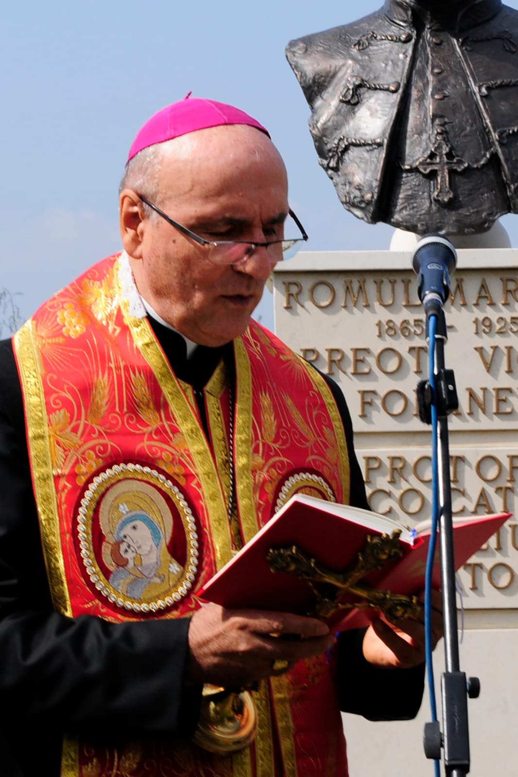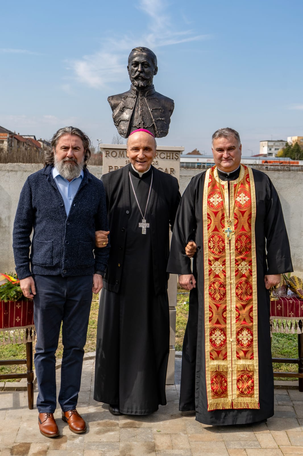 A urmat apoi, în curte bisericii de dezvelirea bustului şi sfințirea acestuia, după care au luat cuvântul oficialități judeţene şi locale. Cei prezenţi au remarcat şi munca excelentă a sculptorului Deak Arpad, cel care a realizat bustul părintelui Romul Marchiş.