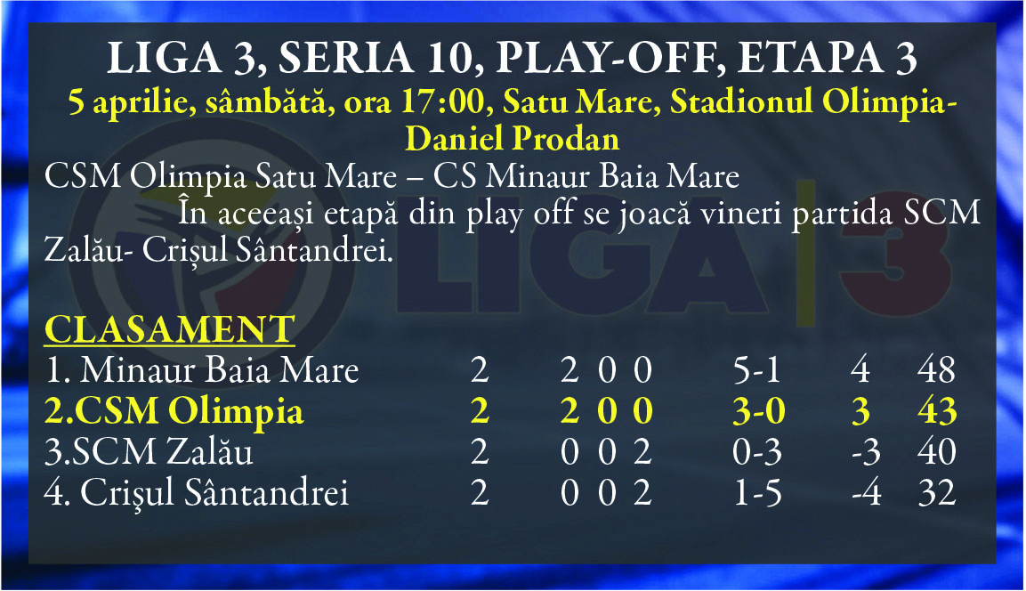 Etapa a 3-a a play-off-ului aduce la Satu Mare un prim derby al Nordului dintre CSM Olimpia și Minaur Baia Mare. Cele două echipe ocupă primele două poziții ale clasamentului și sunt favorite la calificarea la barajul de promovare în Liga a 2-a.
