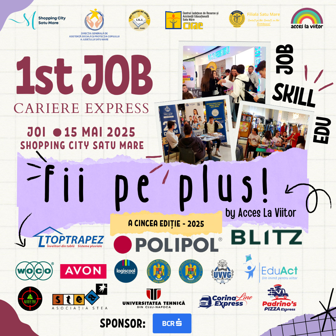 La ediția a V-a a proiectului „1st JOB – Cariere Express", organizat de Asociația Acces La Viitor alături de partenerii săi – Inspectoratul Școlar Județean Satu Mare, CJRAE, DGASPC, CECCAR – filiala Satu Mare și Shopping City Satu Mare – peste 800 de liceeni din județ, inclusiv 32 de tineri din sistemul de protecție specială, se pregătesc să transforme curiozitatea în șansă și informația în decizie, într-un târg educațional și profesional care va avea loc pe 15 mai 2025, de la ora 14:00, la Shopping City Satu Mare, unde toți sătmărenii sunt invitați să susțină energia și potențialul noii generații.
