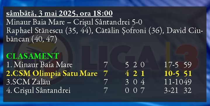 În ultimele două etape, echipa va juca vineri la Sântandrei și apoi acasă cu Minaur Baia Mare, meciuri în care victoria este obligatorie pentru a putea disputa barajul de promovare în Liga 2.