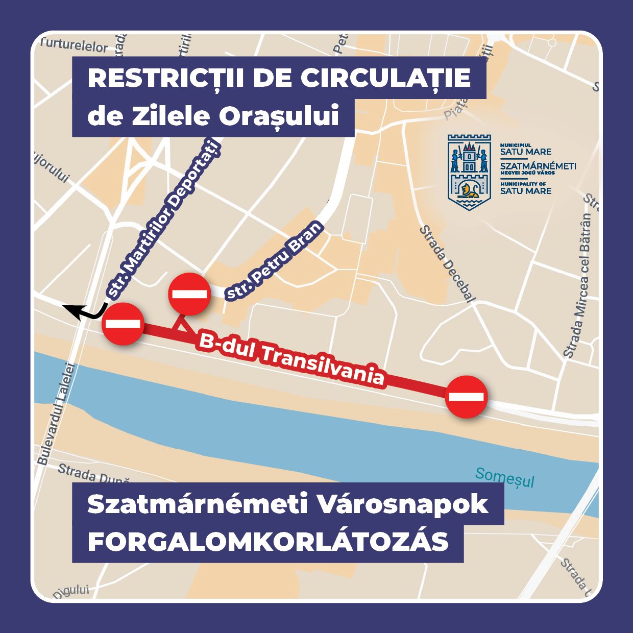 Pentru ca evenimentul să se desfășoare în cele mai bune condiții de siguranță și organizare, autoritățile locale anunță restricții de circulație majore pe durata manifestărilor. Traficul va fi închis pe Bulevardul Transilvania, una dintre principalele artere ale orașului, începând de joi, 29 mai, ora 17.00, și până luni, 2 iunie, ora 07.00.