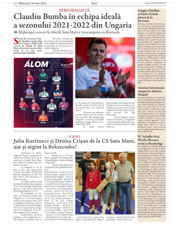 Românii fac senzație în campionatul Ungariei. ETO Gyor, echipă nou promovată în prima ligă a reușit să se califice în Conference League. Este echipa românilor din Ungaria. Paul Anton, Claudiu Bumba și Deian Boldor joacă pentru ETO Gyor. Iar Claudiu Bumba, băimăreanul care și a făcut junioratul la Atletic 94 Satu Mare a fost omul decisiv la Gyor acesta fiind inclus în echipa ideală a sezonului 2024-2025 a primei ligi din Ungaria.