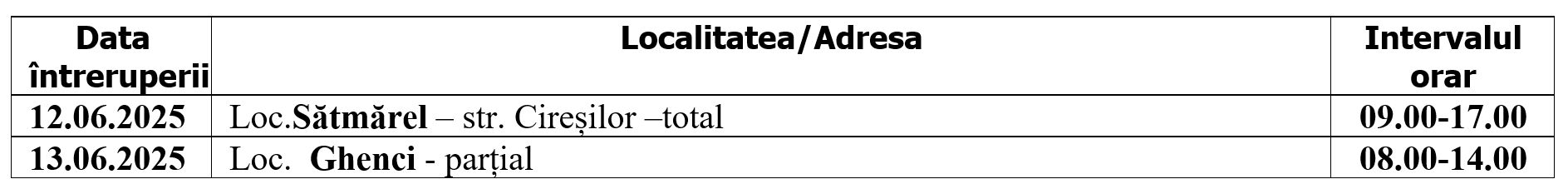 DISTRIBUȚIE ENERGIE ELECTRICĂ ROMANIA S.A. - Sucursala Satu Mare anunţă întreruperea alimentării cu energie electrică: