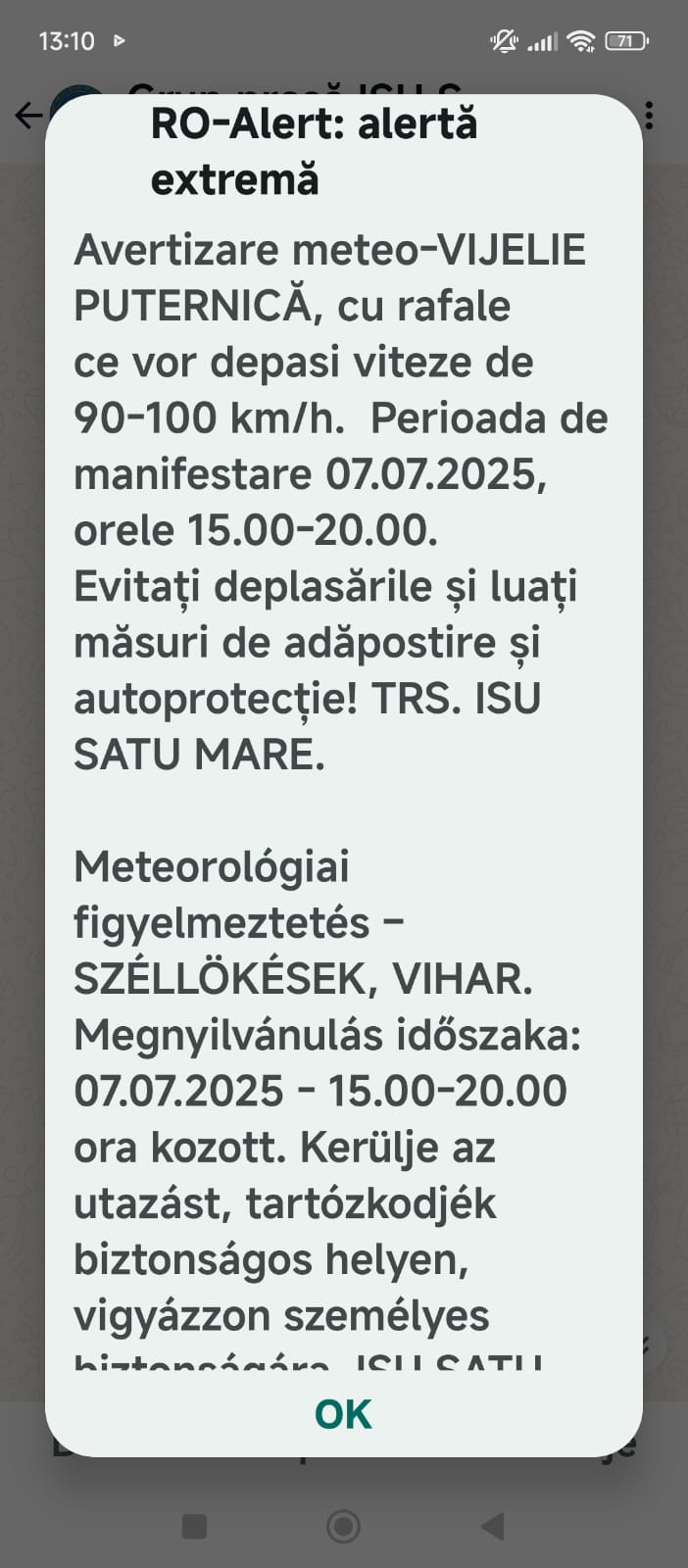 ISU Satu Mare a remis mai multe avertizări RO ALERT de VREME EXTREMĂ!!!