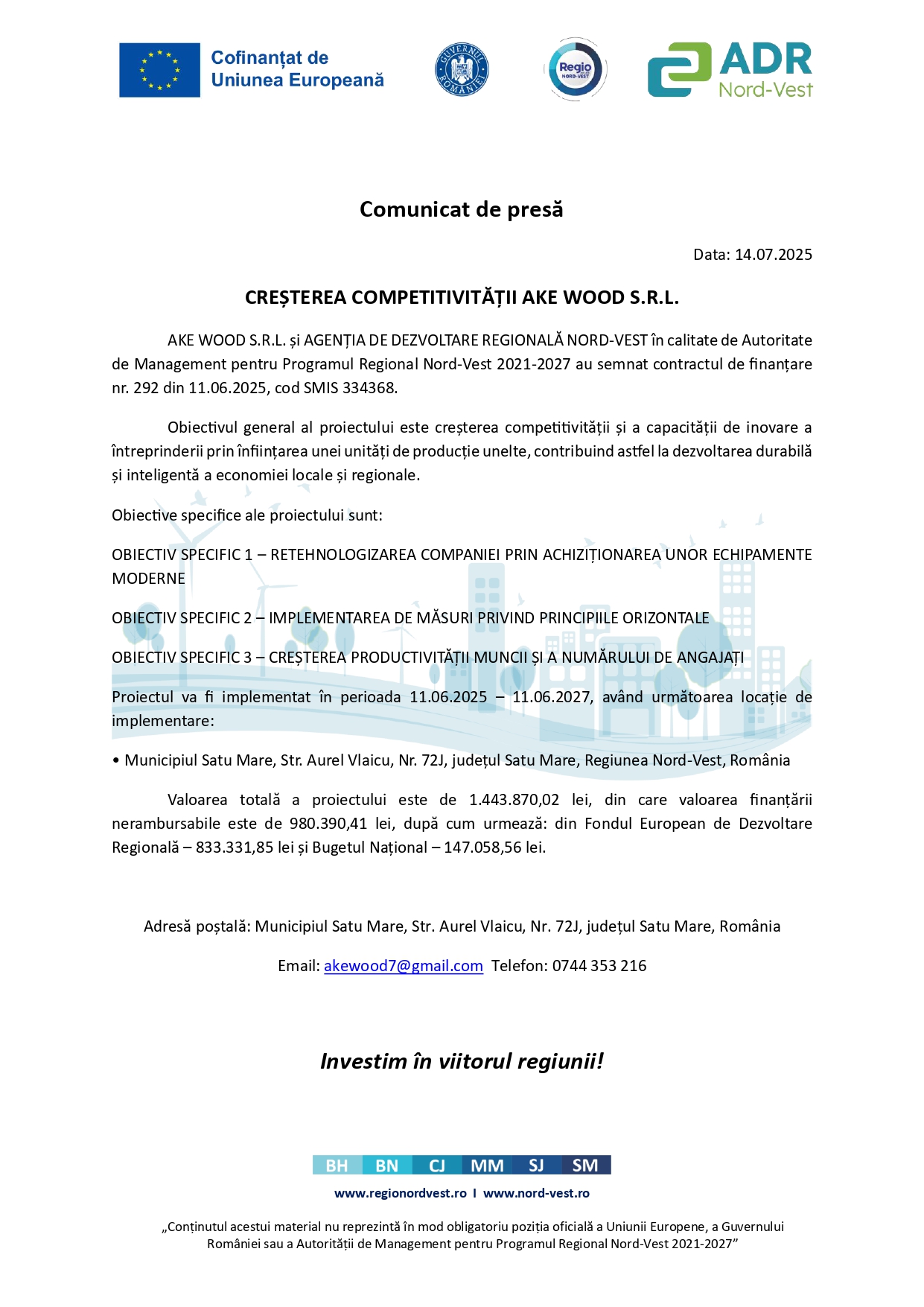 AKE WOOD S.R.L.și AGENȚIA DE DEZVOLTARE REGIONALĂ NORD-VEST în calitate de Autoritate