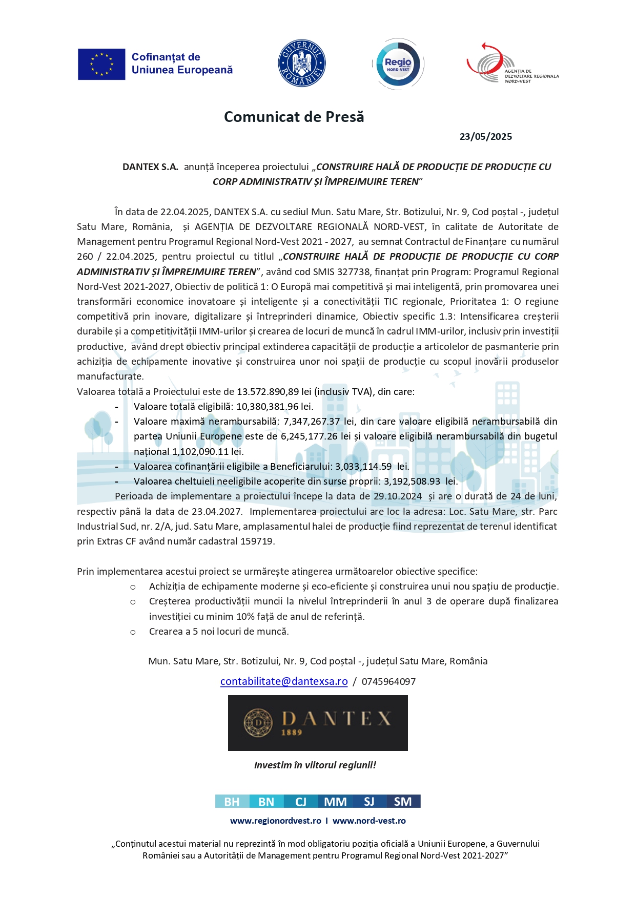 În data de 22.04.2025, DANTEX S.A. cu sediul Mun. Satu Mare, Str. Botizului, Nr. 9, Cod poștal -, județul Satu Mare, România, și AGENȚIA DE DEZVOLTARE REGIONALĂ NORD-VEST, în calitate de Autoritate de Management pentru Programul Regional Nord-Vest 2021 - 2027, au semnat Contractul de Finanțare cu numărul 260 / 22.04.2025, pentru proiectul cu titlul „CONSTRUIRE HALĂ DE PRODUCȚIE DE PRODUCȚIE CU CORP ADMINISTRATIV ȘI ÎMPREJMUIRE TEREN”, având cod SMIS 327738, finanțat prin Program: Programul Regional