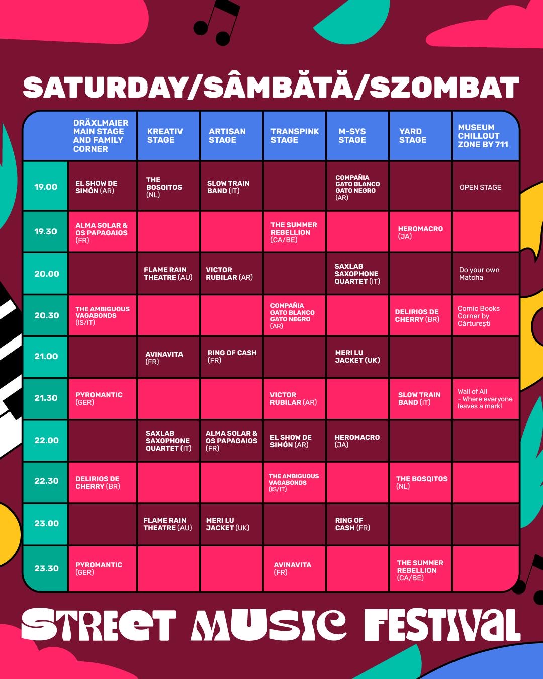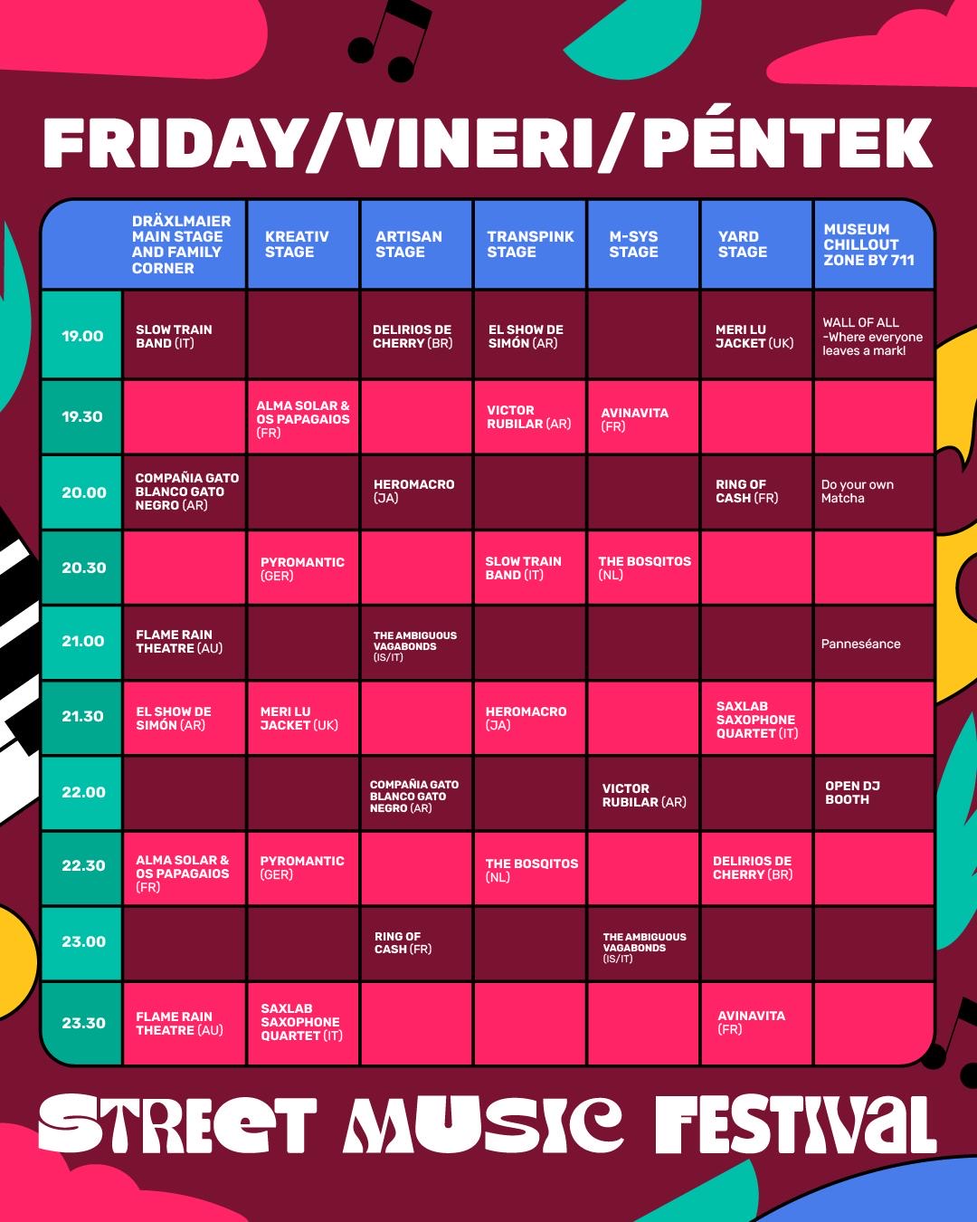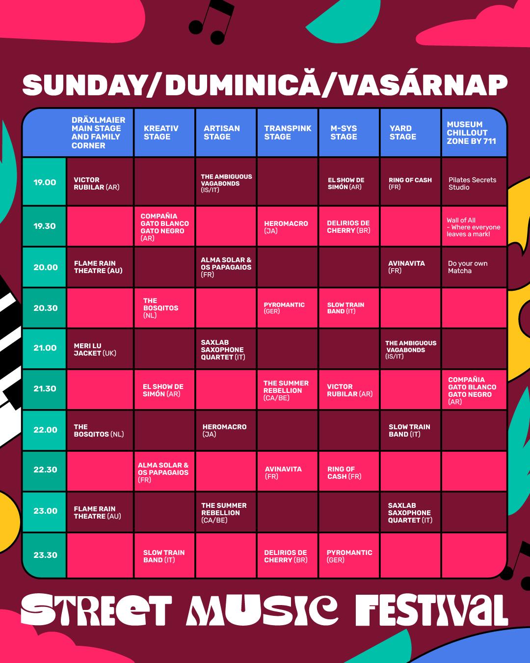 În toate cele trei zile de festival, spectacolele încep la ora 19.00 și se încheie după miezul nopții.