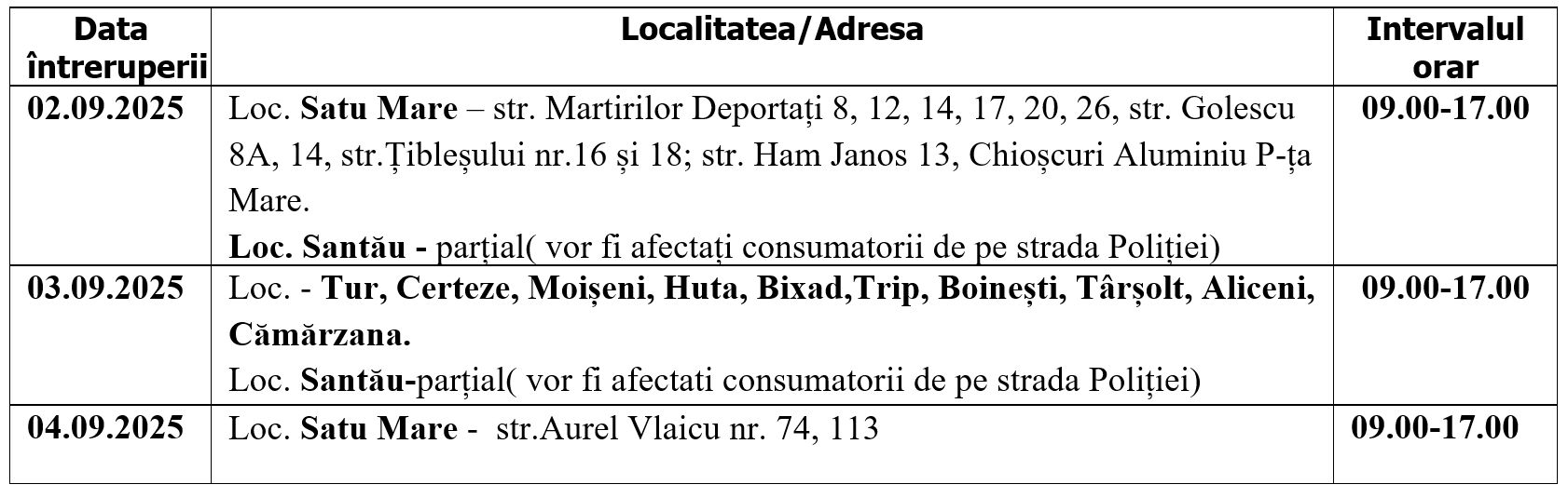 DISTRIBUȚIE ENERGIE ELECTRICĂ ROMANIA S.A. - Sucursala Satu Mare anunţă întreruperea alimentării cu energie electrică: