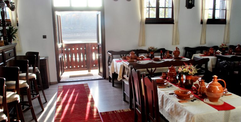Restaurant rustic cu 40 de locuri, amenajat tradițional, cu vase de lut, lăzi de zestre și decor popular .