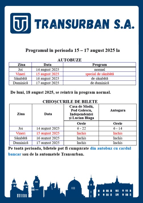Chioșcurile Transurban vor fi închise începând de vineri, 15.08.2025, urmând ca de luni, 18.08.2025, să fie reluat programul normal atât la autobuze cât și la chioșcurile de bilete.