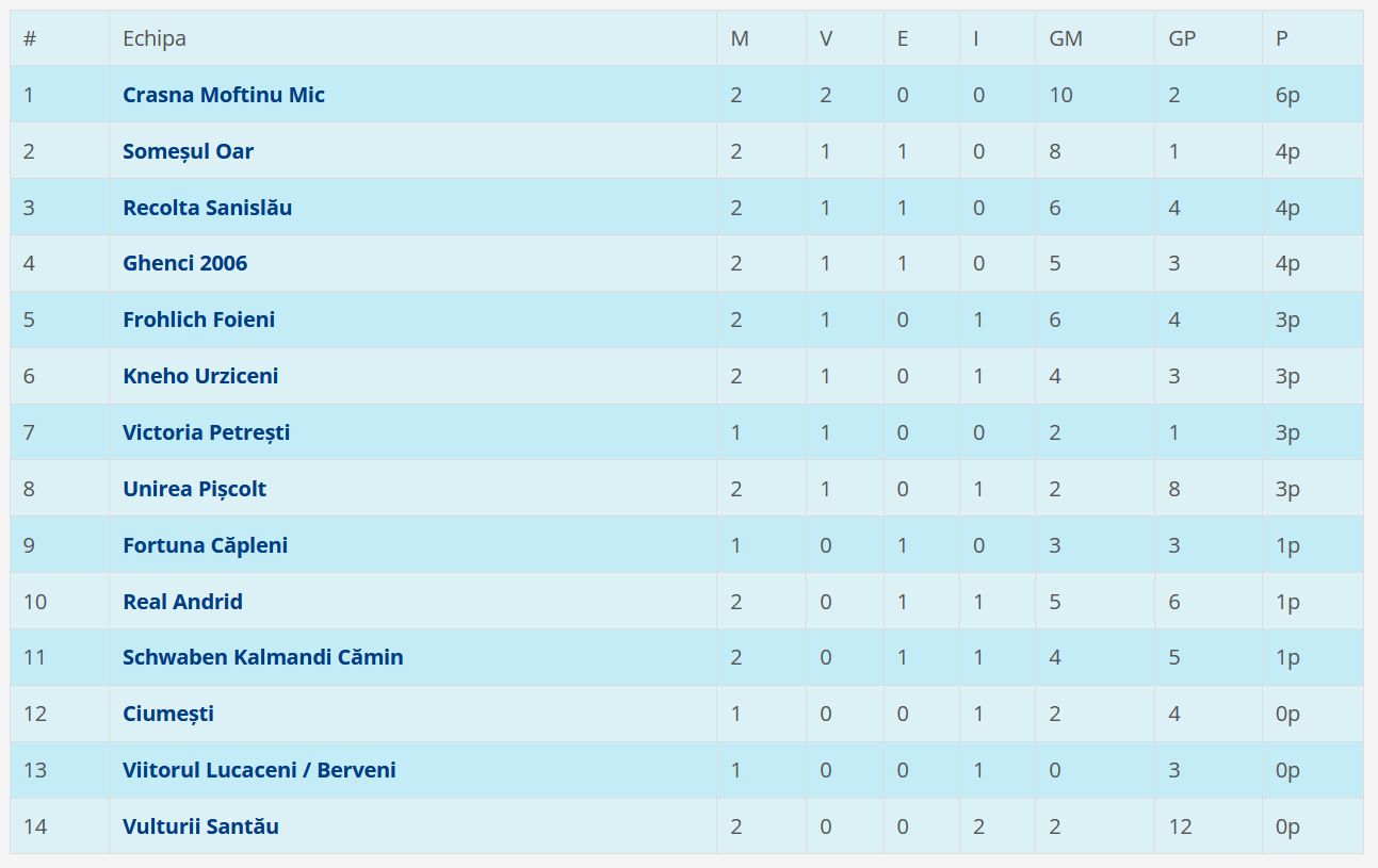 După meciurile de duminică din Seria B a Ligii a 4-a, campioana en-titre Crasna Moftinu Mic a rămas în fruntea clasamentului, fiind totodată singura echipă care are punctaj maxim după două etape. E drept că duminică echipa din Moftin a obținut o victorie la masa verde , deoarece meciul din etapa a doua nu s-a disputat: adversara din Lucăceni nu s-a prezentat la teren, iar cel mai probabil, Crasna va câștiga la „masa verde”.
