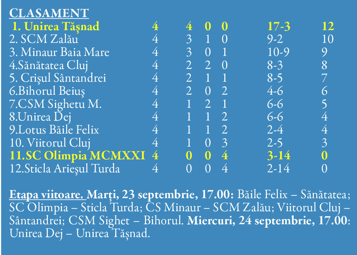 Cel mai interesant meci al etapei se va juca la Baia Mare. Minaur va întâlni pe SCM Zalău într-un etern duel al principalelor candidate la promovare. Unirea Tășnad va juca miercuri la Dej cu o altă...Unire. Iar tășnădenii speră să continue seria pozitivă și să rămână pe prima poziție a clasamentului.