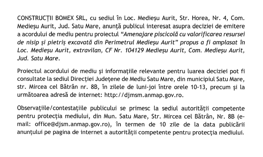 Acasa Publicitate Articol Publicitate ANUNŢ CONSTRUCŢII BOMEX SRL 27.10.2025 00:00 Distribuie Distribuie: Primește ziarul gratuit pe email! Abonează-te și citești ziarul Gazeta Nord-Vest zilnic, gratuit. Abonează-te Articole Similare Publicitate ANUNȚ MEDIU ROMANTIC AIM SRL acum 1 zi Publicitate Anunț SC Bio Piersicuta SRL – pentru Ocolul Silvic Codrii Satmarului acum 3 zile Publicitate Anunt mediu Distribuție Energie Electrică Romania – Sucursala Satu Mare acum 4 zile Publicitate ANUNȚ POMIAN VASILE acum 4 zile Publicitate Anunț Mediu BOVAGRO Pișcari acum 1 saptamana Publicitate Condoleanțe Szabó Francisc acum 2 saptamani Ultimele Articole Locale Complexul de Educație Ecologică „Casa verde” din Grădina Romei, a fost gazda festivității de lansare a unui nou proiect de mediu cu titlul: GRĂDINIȚE SALVATOARE DE RÂURI acum 3 ore Locale Viceprimarul Cristina Tămășan Ilieș felicită Poliția Locală. Acțiuni intensificate împotriva cerșetoriei în Satu Mare acum 3 ore Locale Peste 10.000 de cărți electronice de identitate emise în Satu Mare. Viceprimarul Raul Băbțan: „Digitalizarea devine realitate” acum 3 ore Locale Deputatul Mircea Govor: Bugetul României a fost adoptat. Investiții importante pentru județul Satu Mare acum 4 ore Locale Cea mai mare creșă din Satu Mare, aproape de finalizare: 110 locuri pentru copii acum 4 ore Locale Deratizare în Satu Mare, în perioada 23–27 martie 2026. Avertisment pentru populație acum 4 ore Cele mai citite 1 NORD VEST TV. Slăbitul cu injecții, între speranță și risc. Avertismentul unui medic gastroenterolog din Satu Mare 2 APASERV. Grupa Albinuțelor de la Grădinița 14 Mai a descoperit drumul apei 3 Cea mai mare creșă din Satu Mare, aproape de finalizare: 110 locuri pentru copii 4 Viceprimarul Cristina Tămășan Ilieș felicită Poliția Locală. Acțiuni intensificate împotriva cerșetoriei în Satu Mare 5 Complexul de Educație Ecologică „Casa verde” din Grădina Romei, a fost gazda festivității de lansare a unui nou proiect de mediu cu titlul: GRĂDINIȚE SALVATOARE DE RÂURI Din aceeasi categorie ANUNȚ MEDIU ROMANTIC AIM SRL acum 1 zi Anunț SC Bio Piersicuta SRL – pentru Ocolul Silvic Codrii Satmarului acum 3 zile Anunt mediu Distribuție Energie Electrică Romania – Sucursala Satu Mare acum 4 zile ANUNȚ POMIAN VASILE acum 4 zile Anunț Mediu BOVAGRO Pișcari acum 1 saptamana Ultimele stiri Complexul de Educație Ecologică „Casa verde” din Grădina Romei, a fost gazda festivității de lansare a unui nou proiect de mediu cu titlul: GRĂDINIȚE SALVATOARE DE RÂURI acum 3 ore Viceprimarul Cristina Tămășan Ilieș felicită Poliția Locală. Acțiuni intensificate împotriva cerșetoriei în Satu Mare acum 3 ore Peste 10.000 de cărți electronice de identitate emise în Satu Mare. Viceprimarul Raul Băbțan: „Digitalizarea devine realitate” acum 3 ore Deputatul Mircea Govor: Bugetul României a fost adoptat. Investiții importante pentru județul Satu Mare acum 4 ore Cea mai mare creșă din Satu Mare, aproape de finalizare: 110 locuri pentru copii acum 4 ore