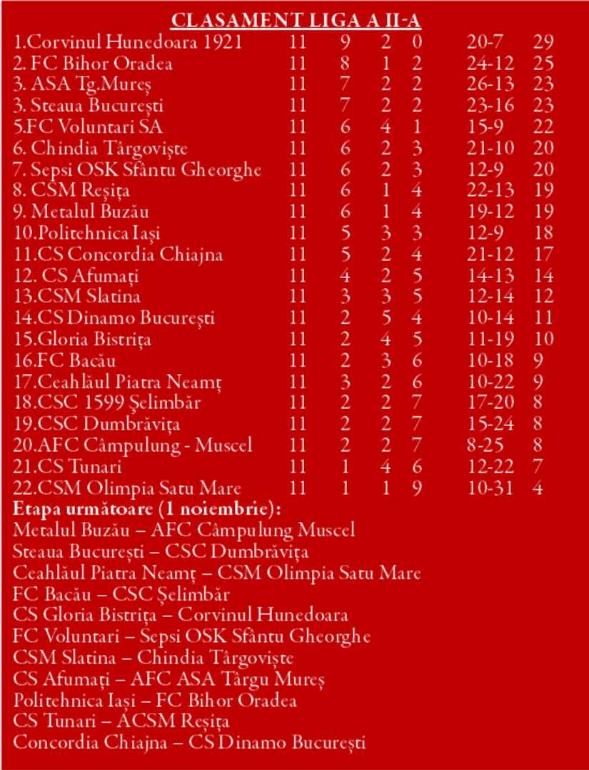 Corvinul Hunedoara continuă să conducă clasamentul Ligii a 2-a și după meciurile etapei a 11-a. Hunedorenii s-au impus, 2-0 cu Bacău și au șase puncte avantaj în fața principalelor urmăritoare, ASA ȘI Steaua.
