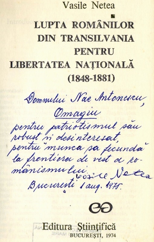 Ilustrăm materialul nostru cu dedicațiile lui Vasile Netea pe cărțile sale dăruite lui Nae Antonescu, găzduite astăzi de Atelierul Memorial din incinta Bibliotecii Județene Satu Mare. De asemenea, cu o fotografie a lui Vasile Netea cu o dedicaţie către acelaşi „părinte al revuisticii” trăitor la Terebeşti. Ceea ce afirma la adresa lui Nae Antonescu a demonstrat şi Vasile Netea de-a lungul întregii sale vieţi, patriotismul său robust şi dezinteresat, pentru munca sa fecundă la temelia românismului.