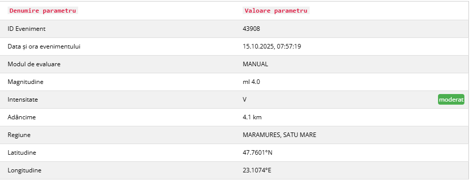 Un cutremur cu magnitudinea de 4,0 grade pe scara Richter s-a produs în dimineața zilei de 15 octombrie 2025, la ora 07:57:20 (ora locală), în județul Satu Mare, având epicentrul în zona Băbășești – Potău – Cărășeu – Culciu.