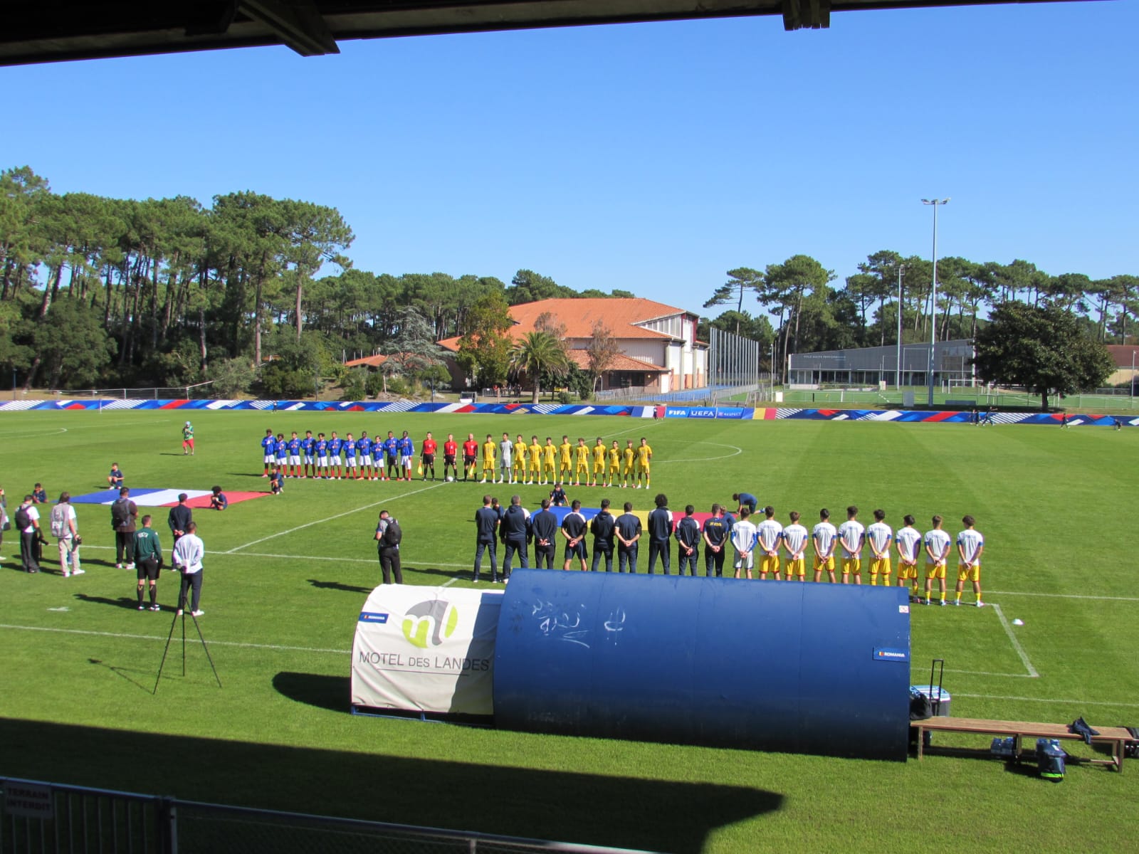 Într-un meci de mare angajament, disputat la Capbreton, în care gazdele au avut mai multe șanse de a înscrie, tricolorii au reușit să deschidă scorul în minutul 81, sătmăreanul Darius Bota a creat faza din care micii tricolori au obținut o lovitură de la 11m, transformată de Andrei Niculcea .