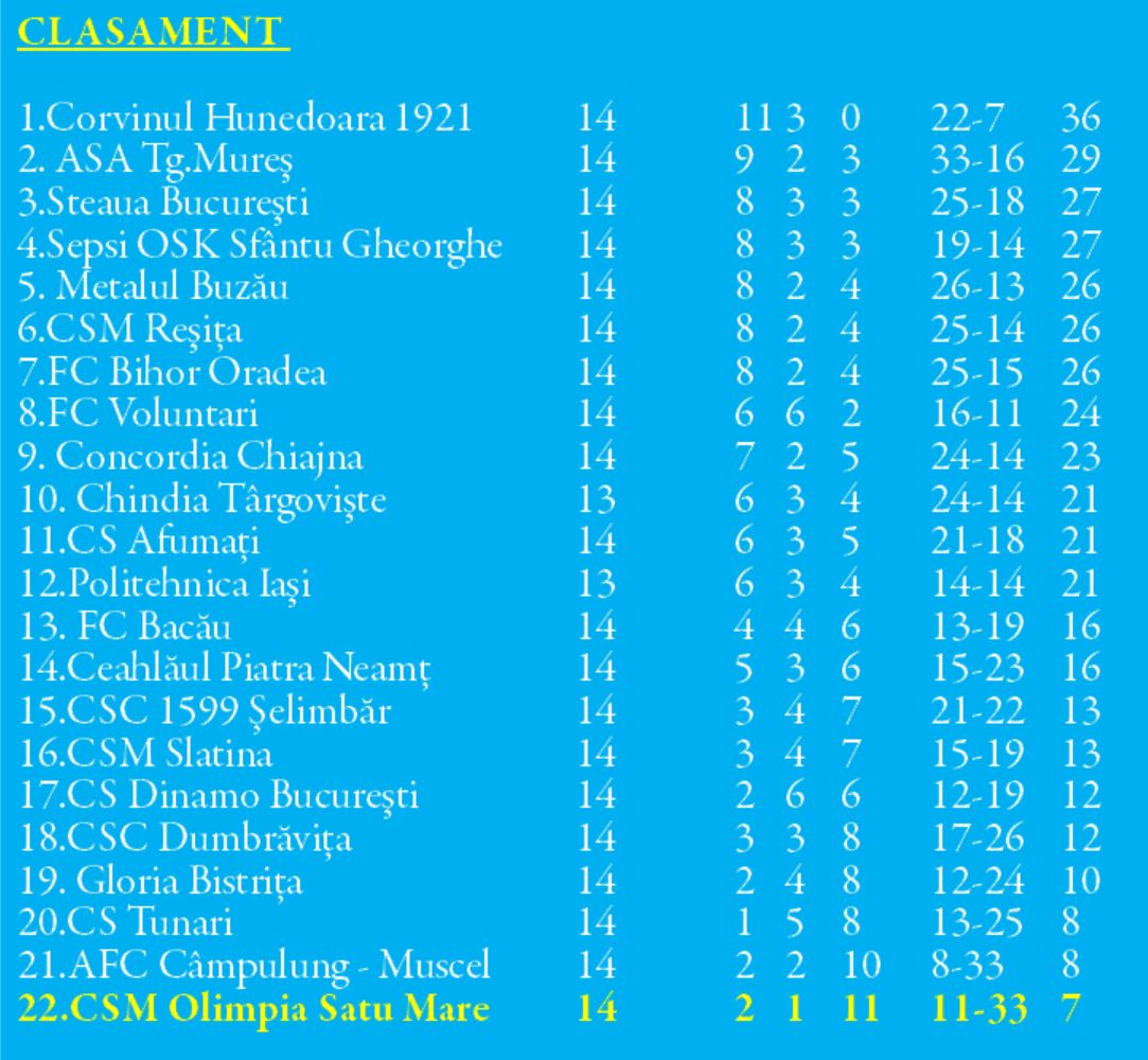 Sâmbătă, galben-albaștrii au reușit să obțină toate cele trei puncte în deplasarea de la Gloria Bistrița, impunându-se cu 1–0, într-un meci disputat pe un teren aproape impracticabil. Este prima victorie a echipei sub comanda antrenorului Alexandru Botoș și abia al doilea meci din acest sezon în care Olimpia nu primește gol.