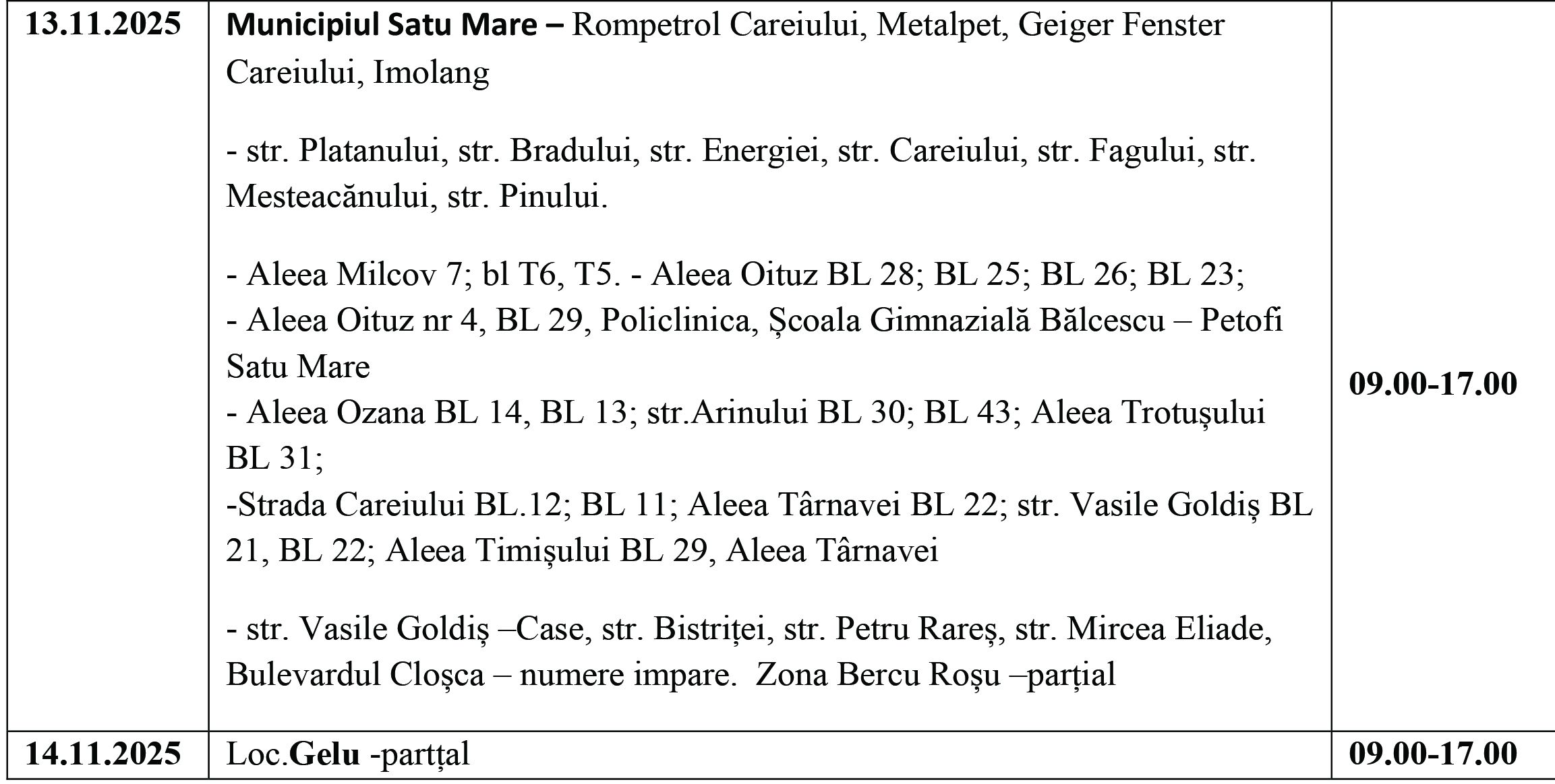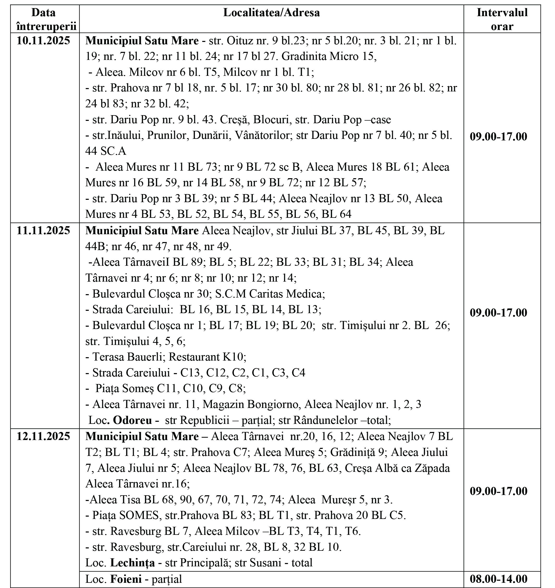 DISTRIBUȚIE ENERGIE ELECTRICĂ ROMANIA S.A. - Sucursala Satu Mare anunţă întreruperea alimentării cu energie electrică: