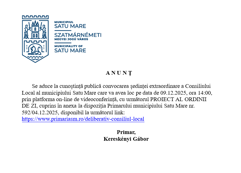 Se aduce la cunoștință publică convocarea ședinței extraordinare a Consiliului Local al municipiului Satu Mare care va avea loc pe data de 09.12.2025, ora 14:00, prin platforma on-line de videoconferință, cu următorul PROIECT AL ORDINII DE ZI, cuprins în anexa la dispoziția Primarului municipiului Satu Mare nr. 592/04.12.2025, disponibil la următorul link: https://www.primariasm.ro/deliberativ-consiliul-local
